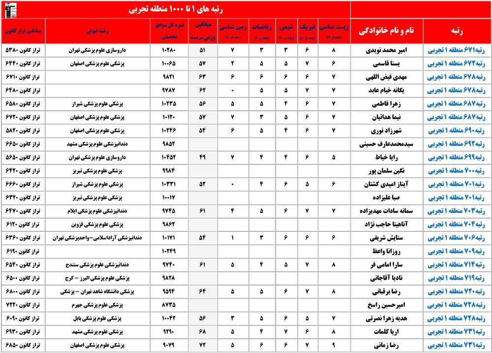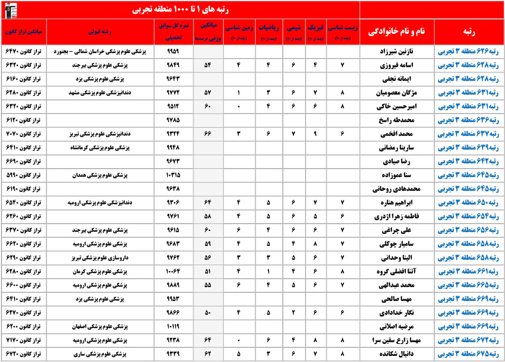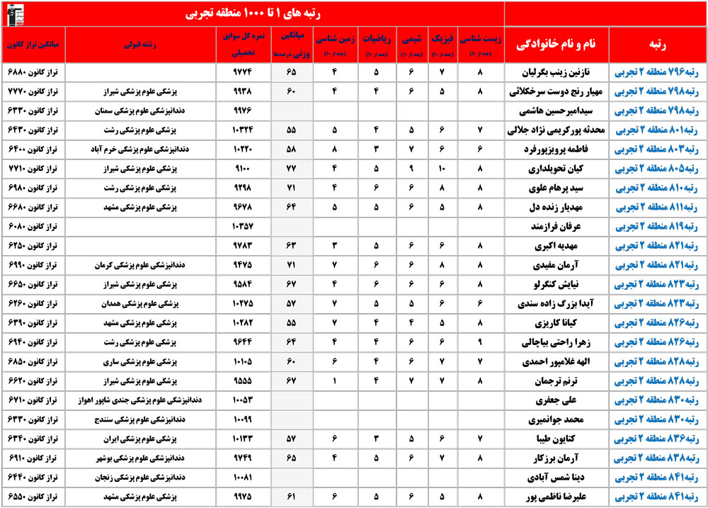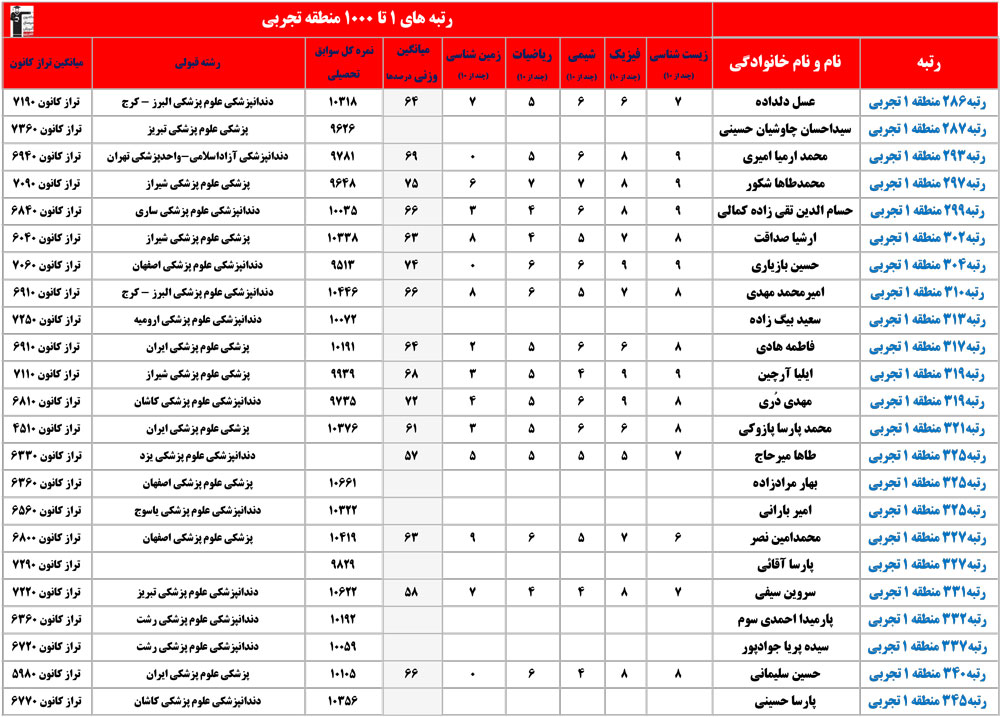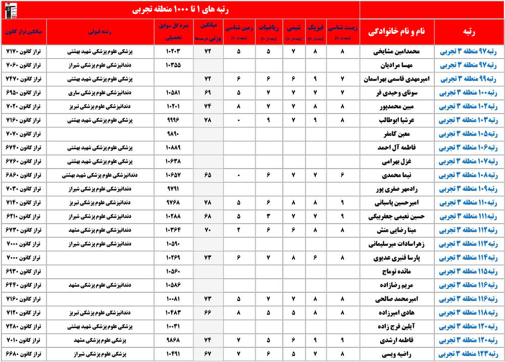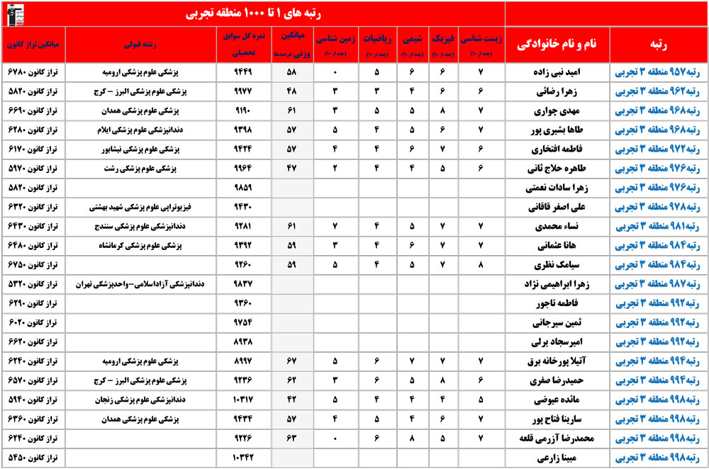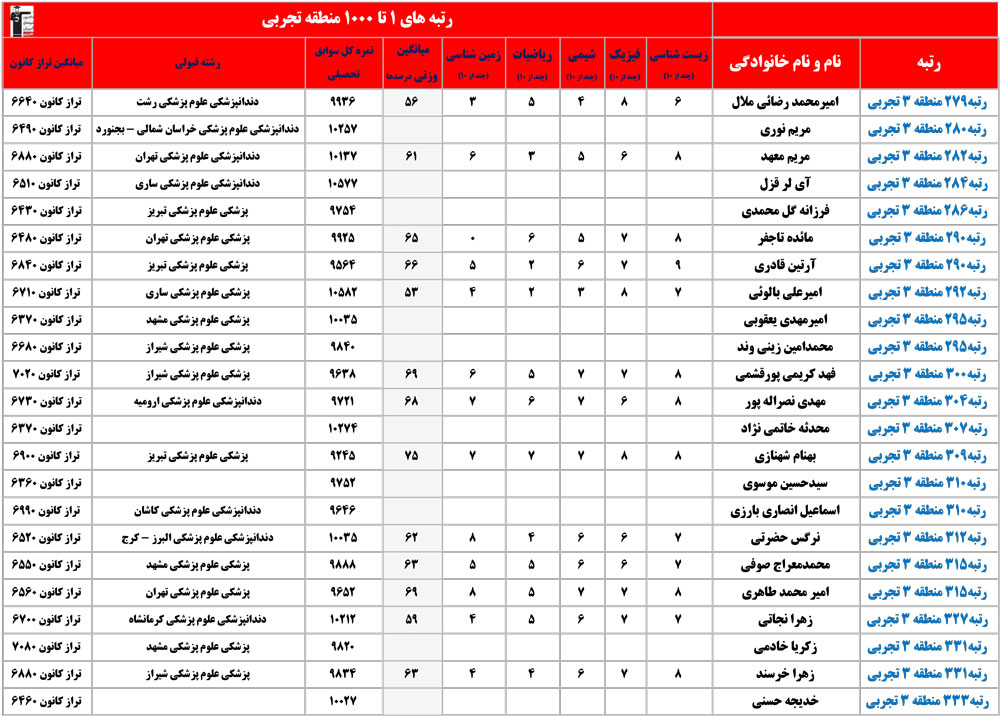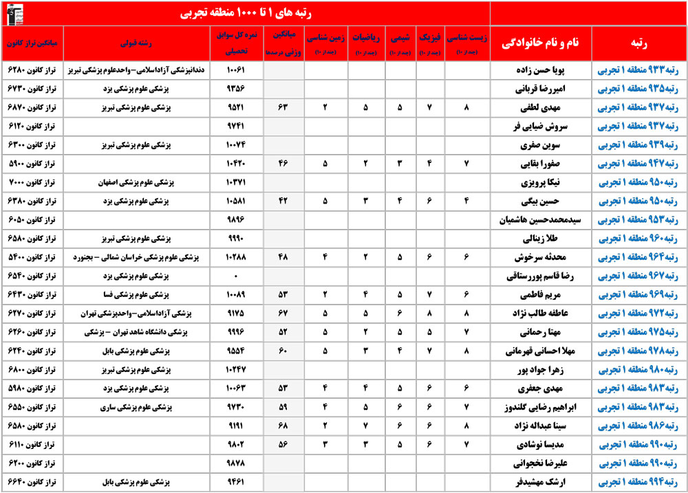 تجربی: رشتههای قبولی رتبههای زیر 1000 منطقه 1، 2 و 3 + درصد ها