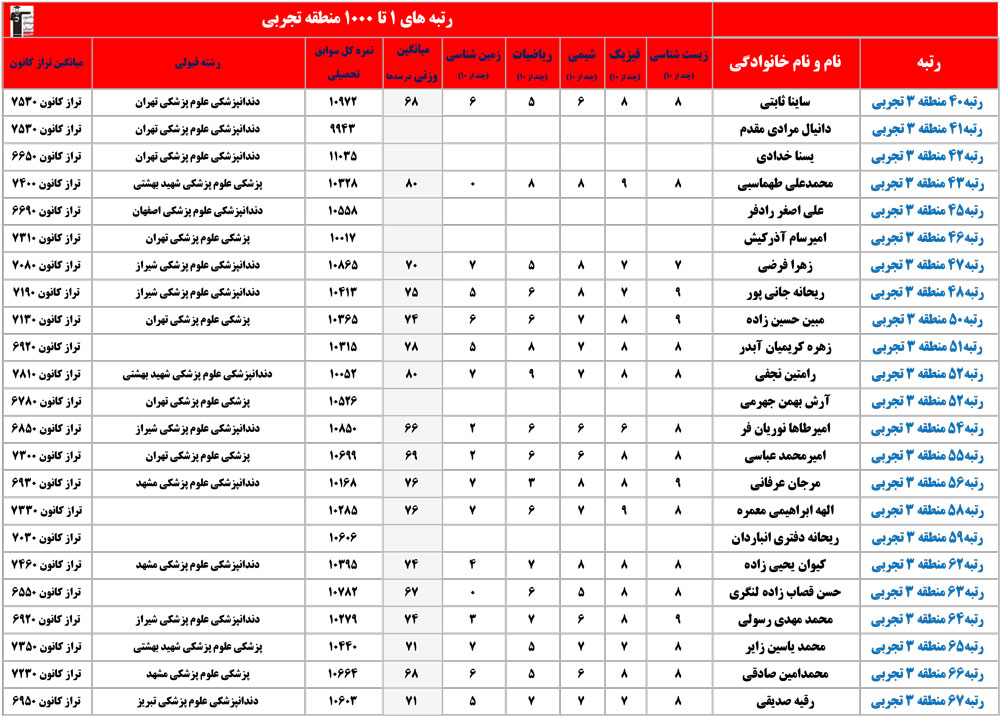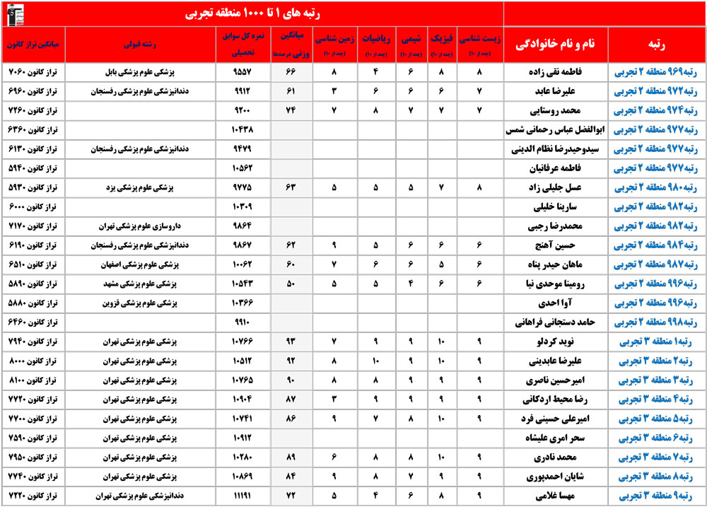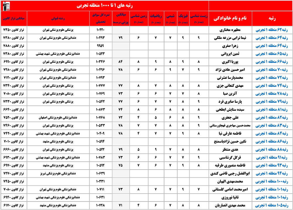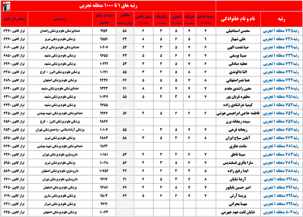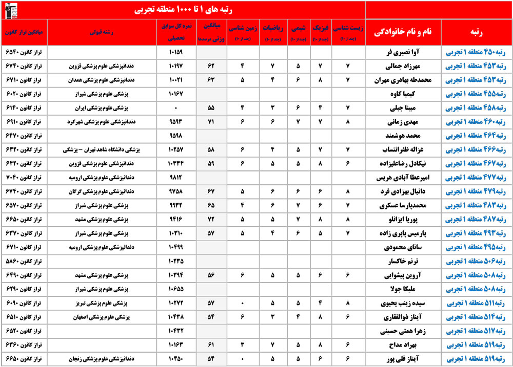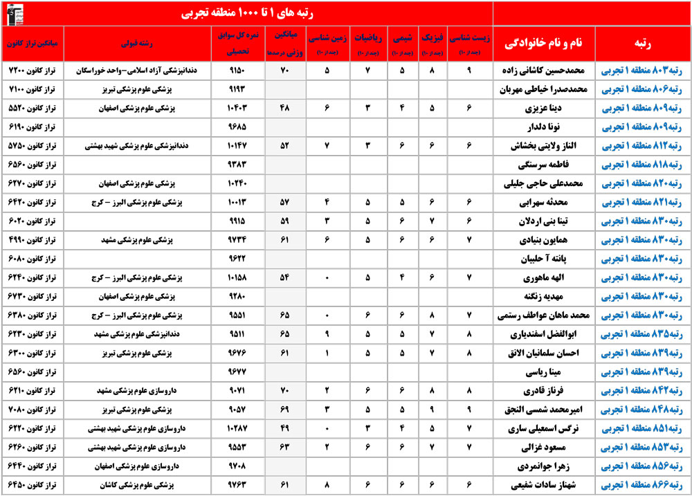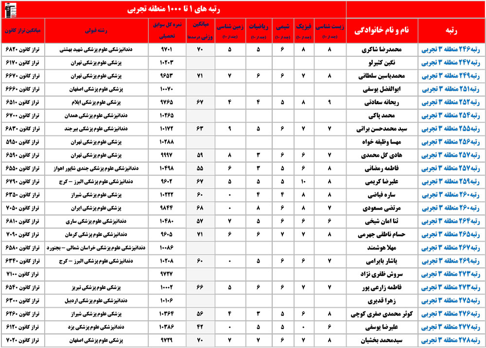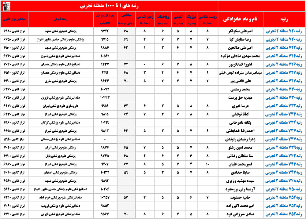 تجربی: رشتههای قبولی رتبههای زیر 1000 منطقه 1، 2 و 3 + درصد ها