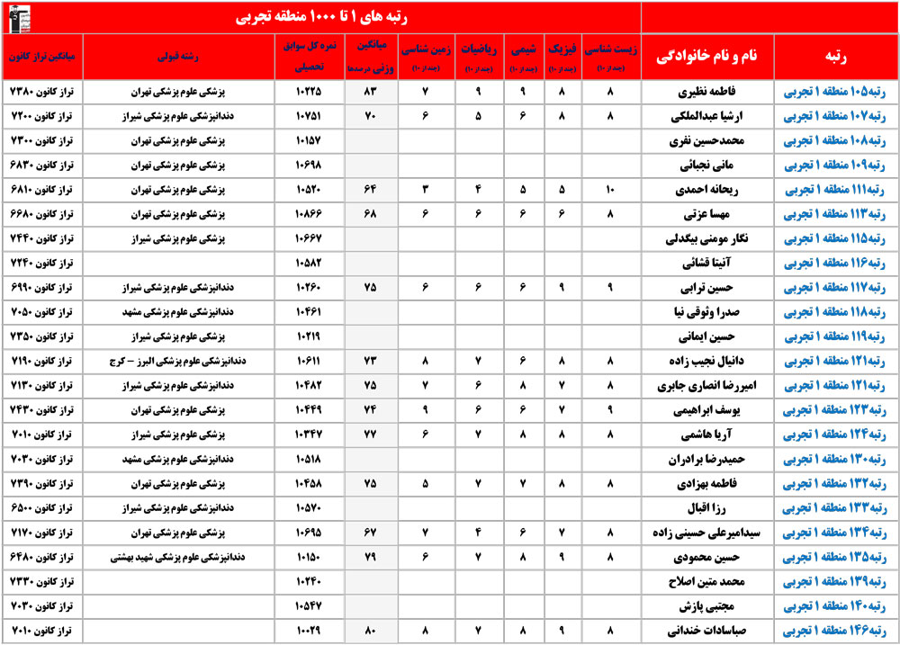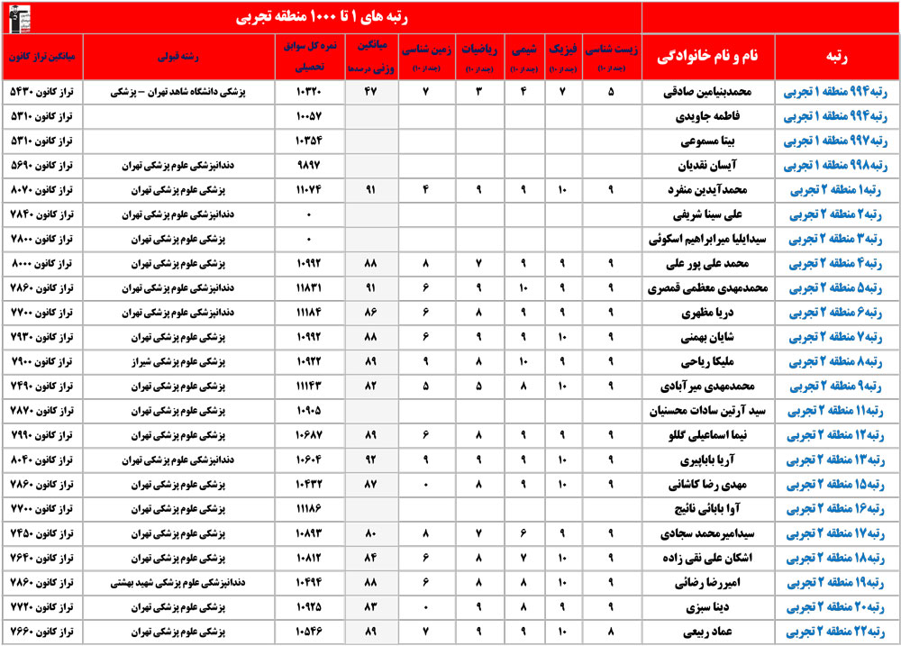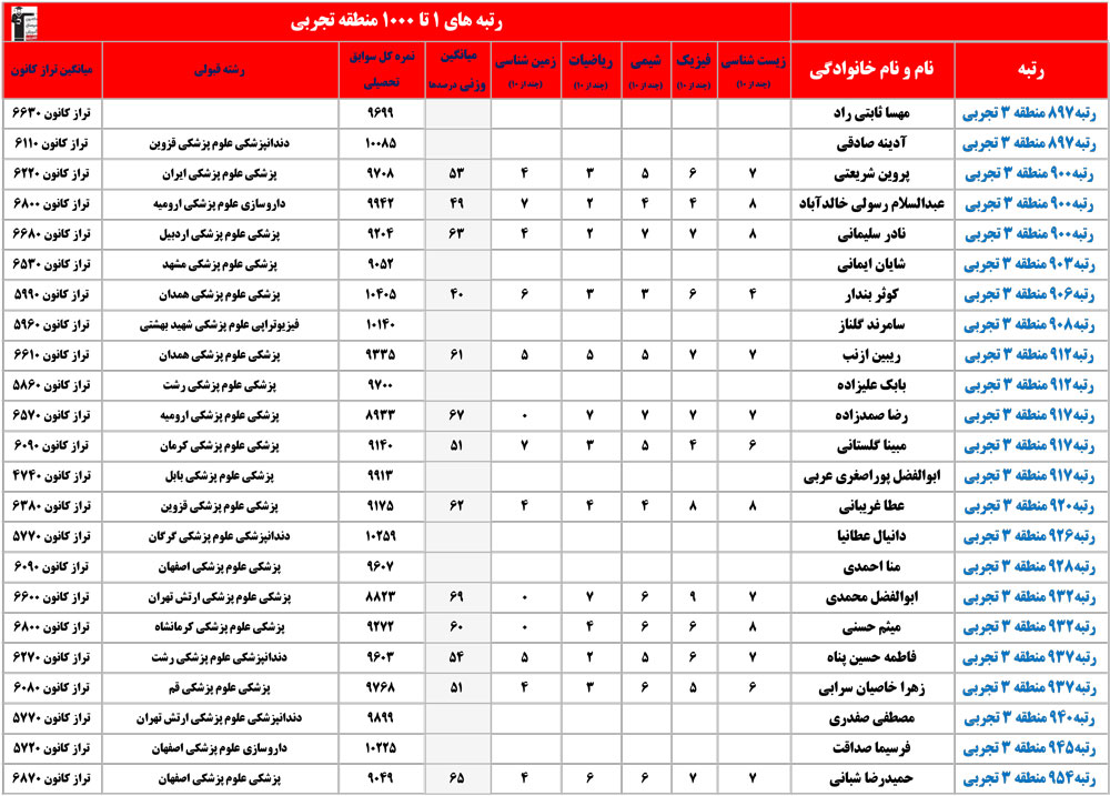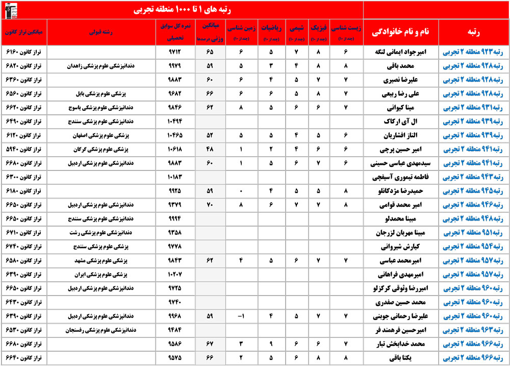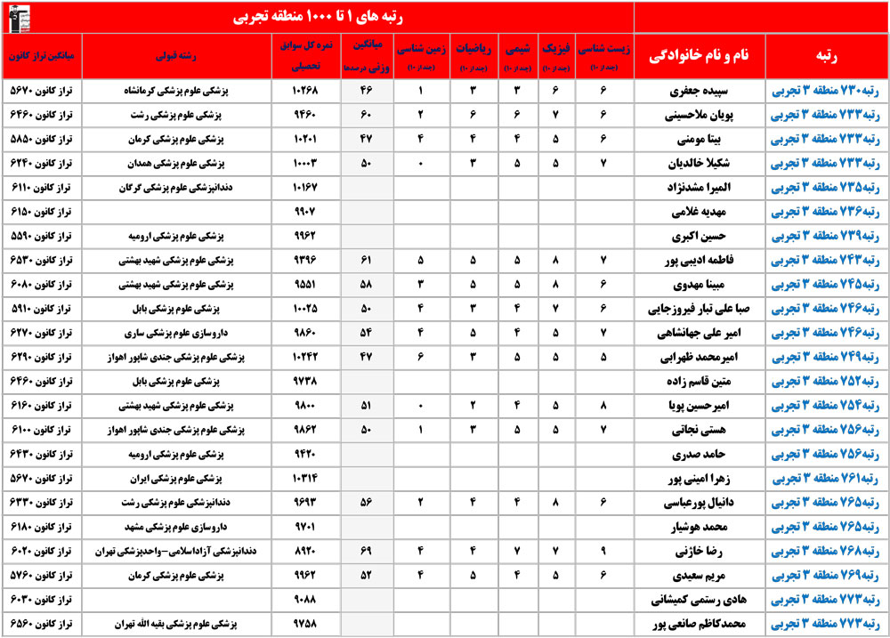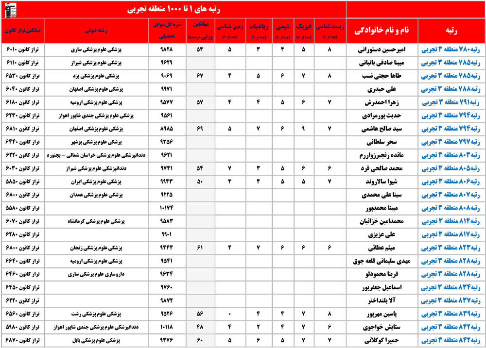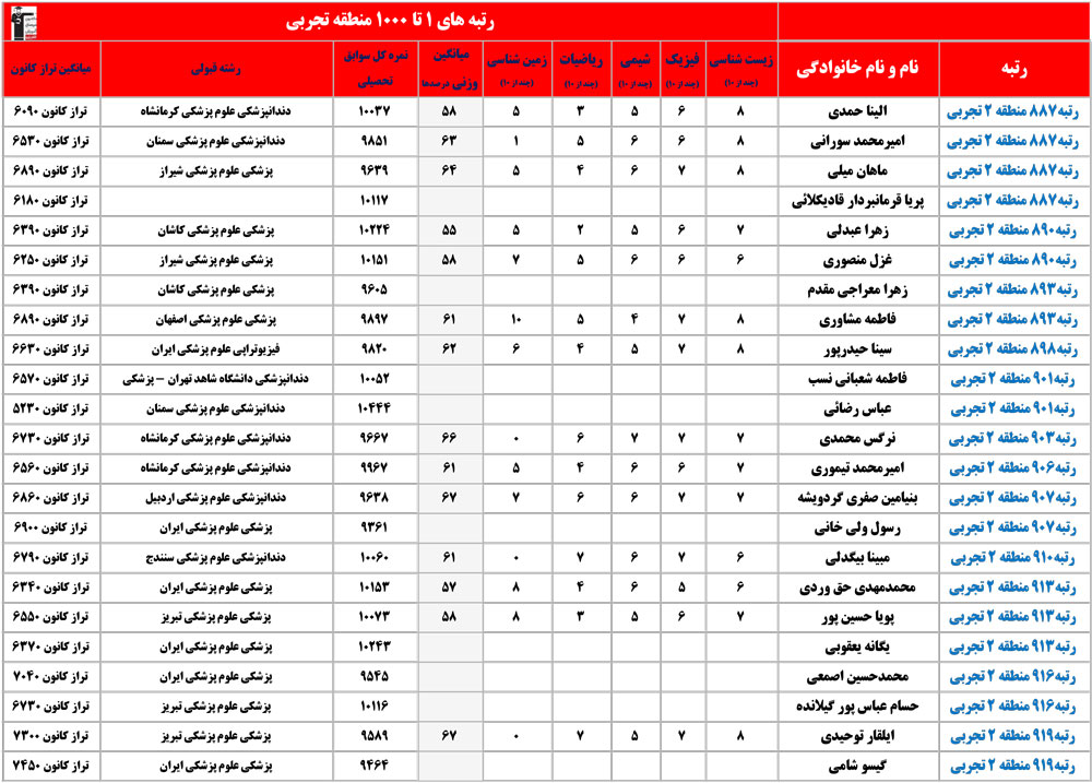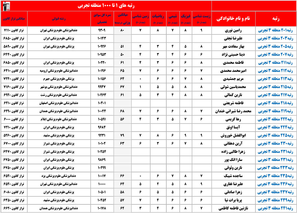 تجربی: رشتههای قبولی رتبههای زیر 1000 منطقه 1، 2 و 3 + درصد ها