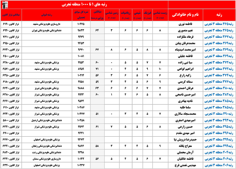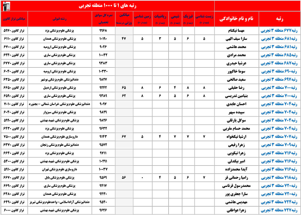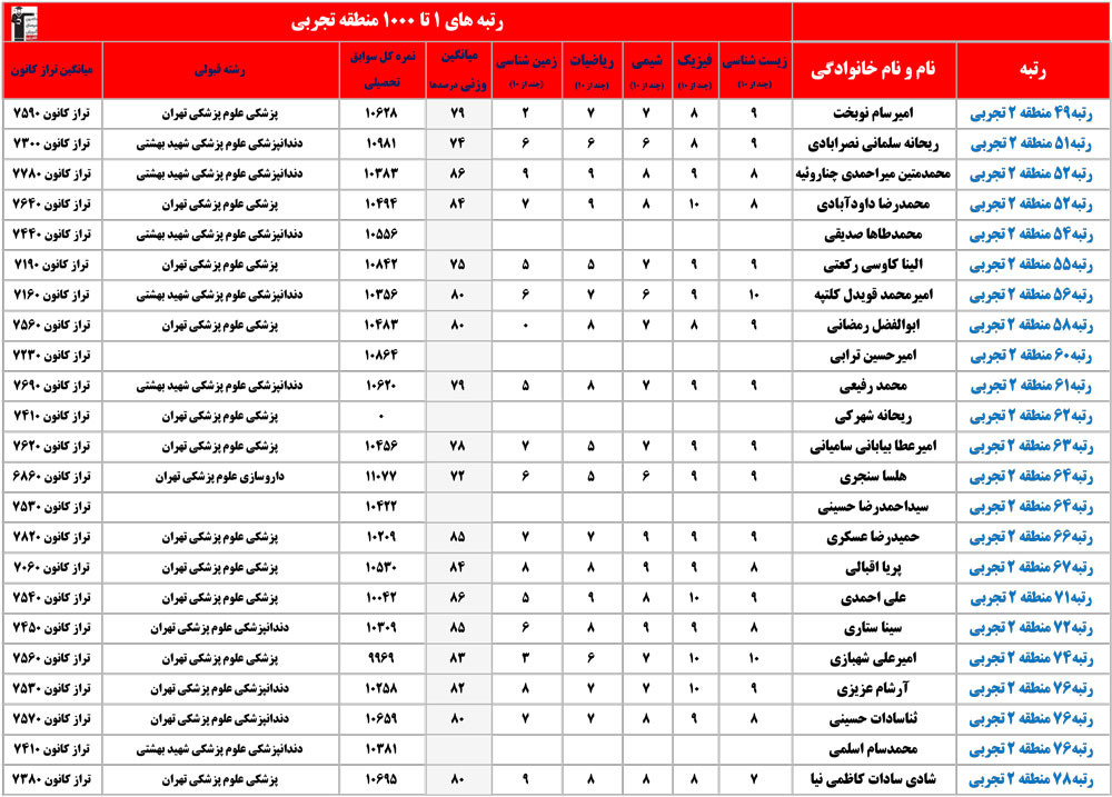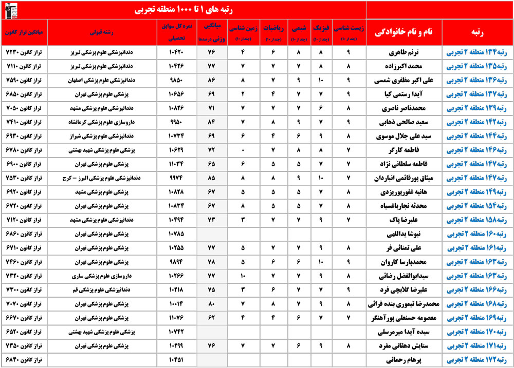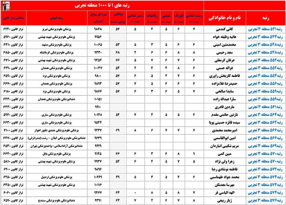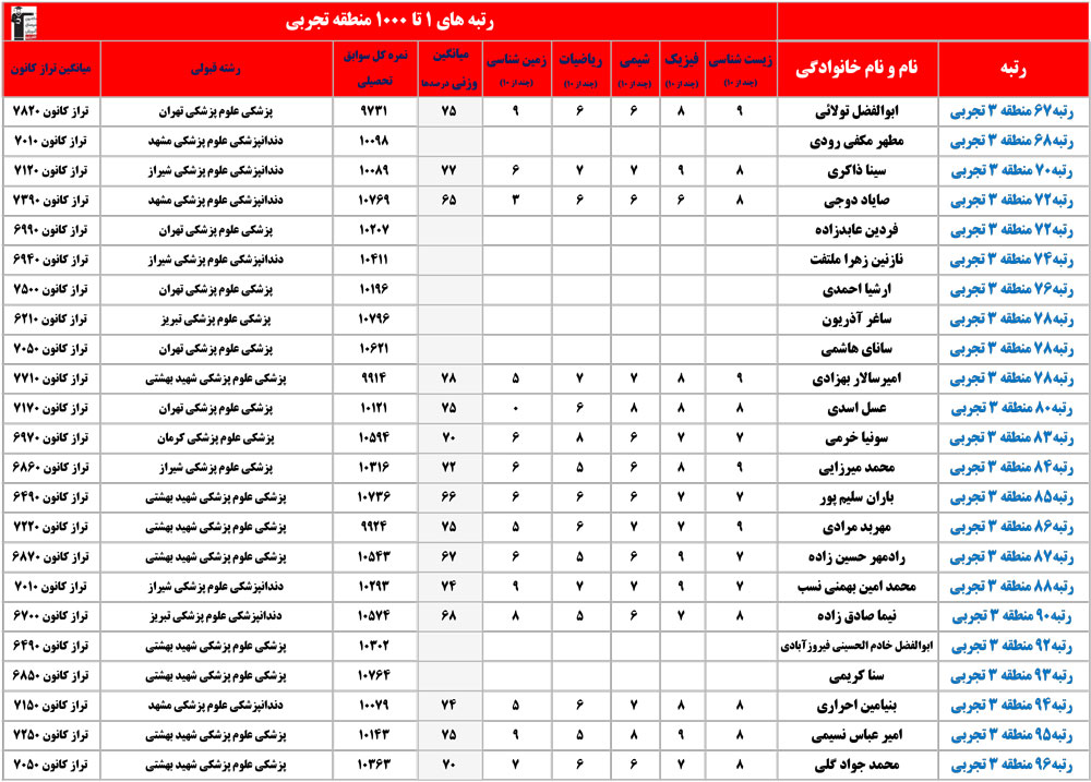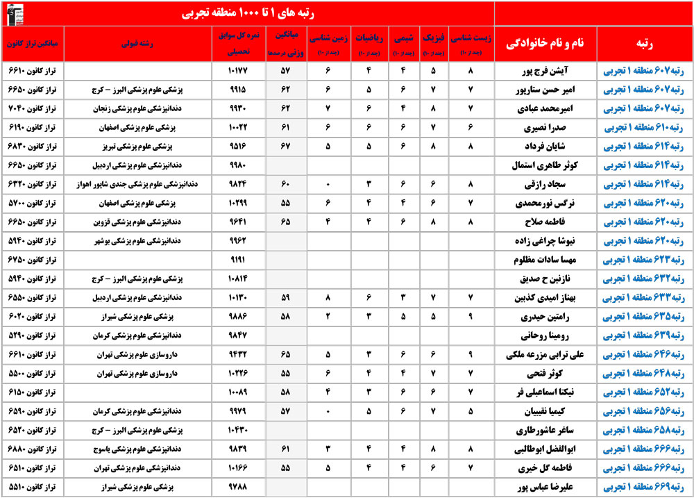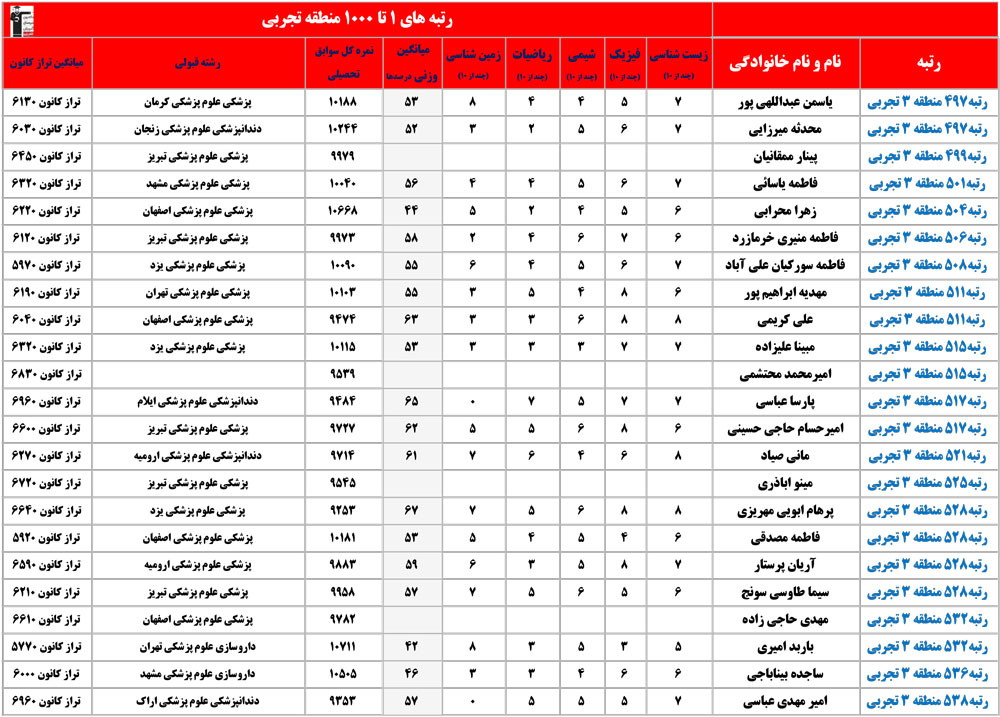 تجربی: رشتههای قبولی رتبههای زیر 1000 منطقه 1، 2 و 3 + درصد ها