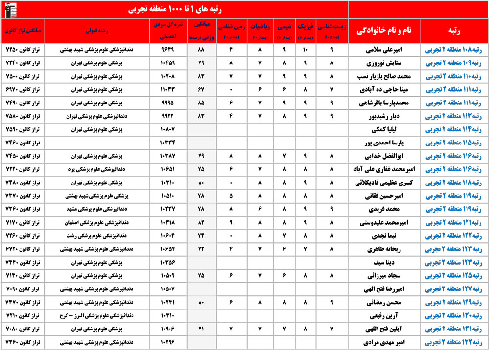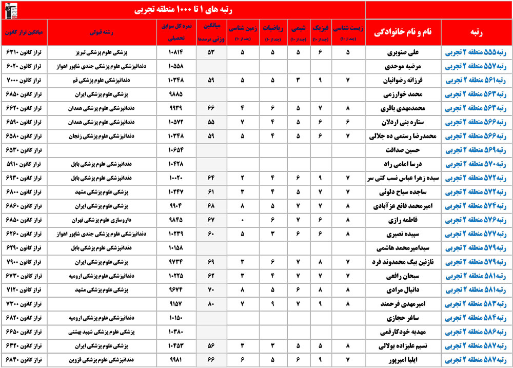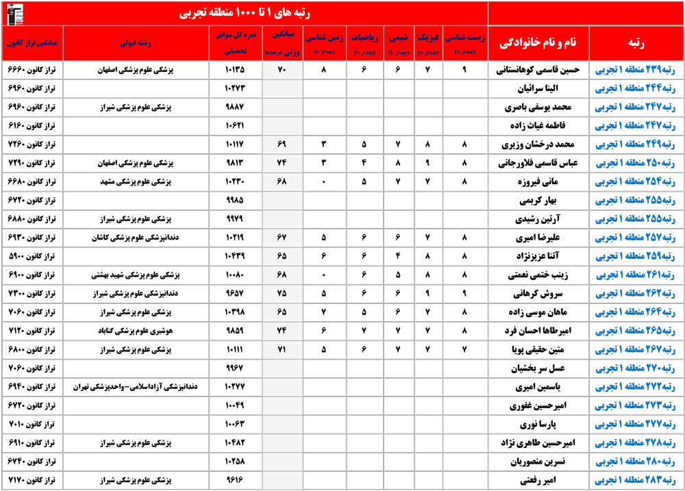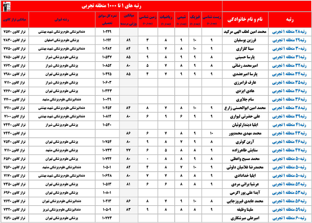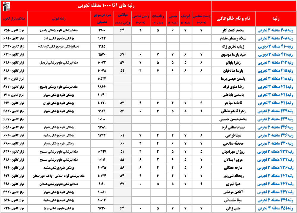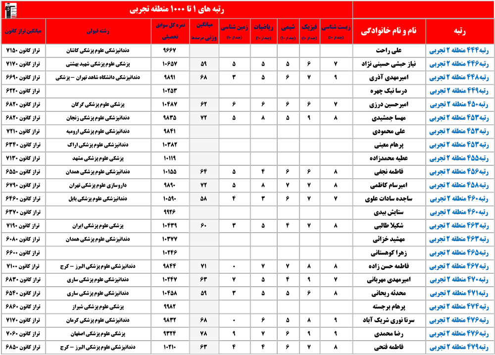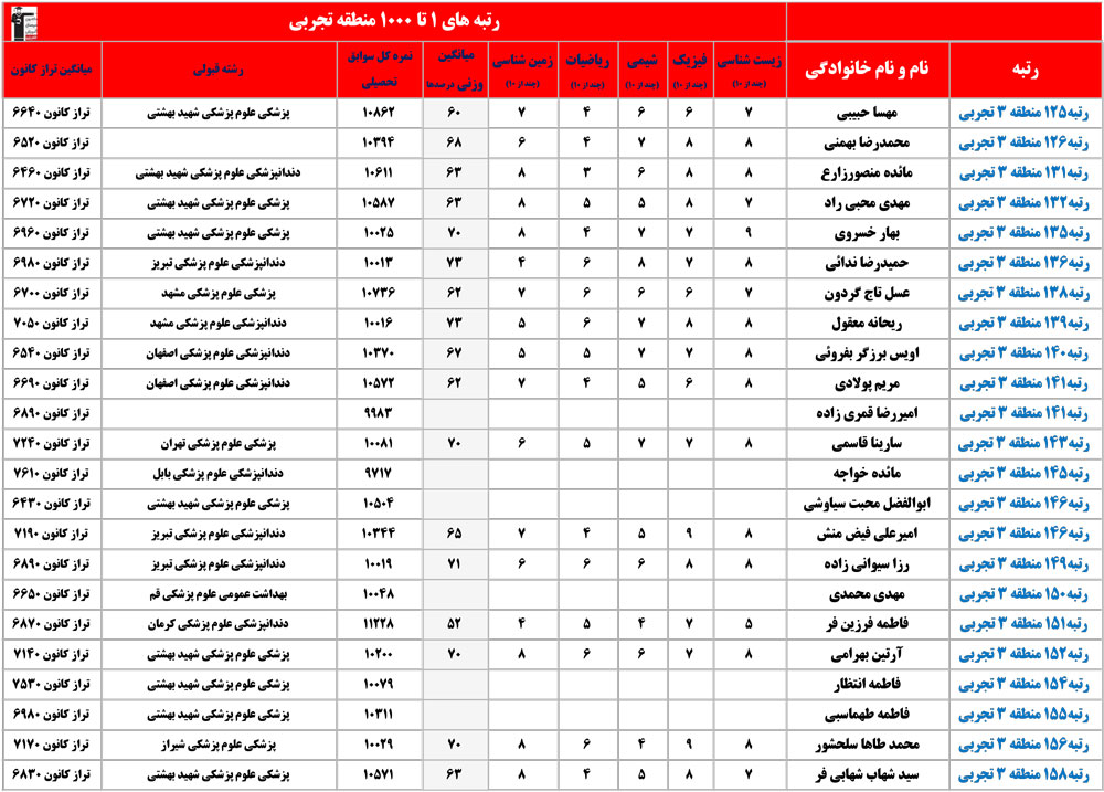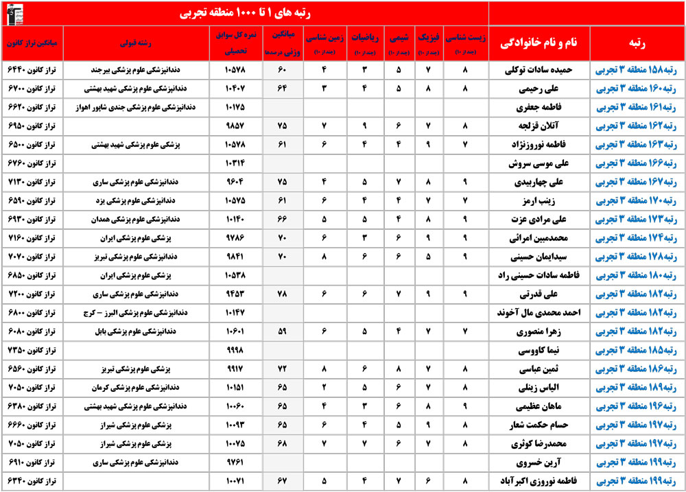 تجربی: رشتههای قبولی رتبههای زیر 1000 منطقه 1، 2 و 3 + درصد ها