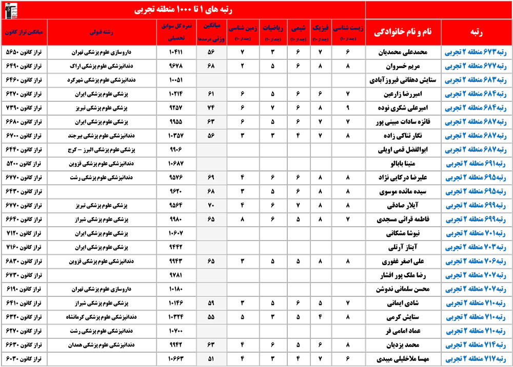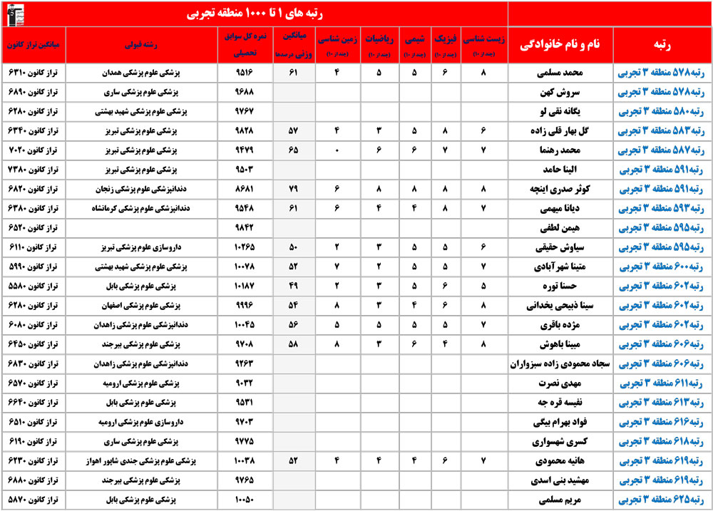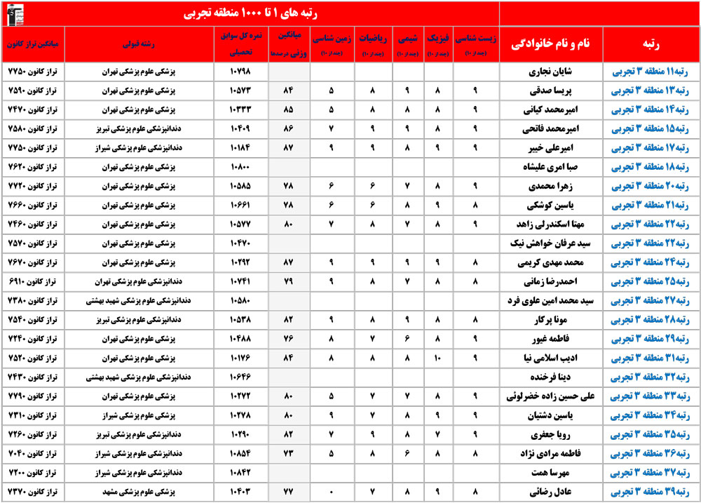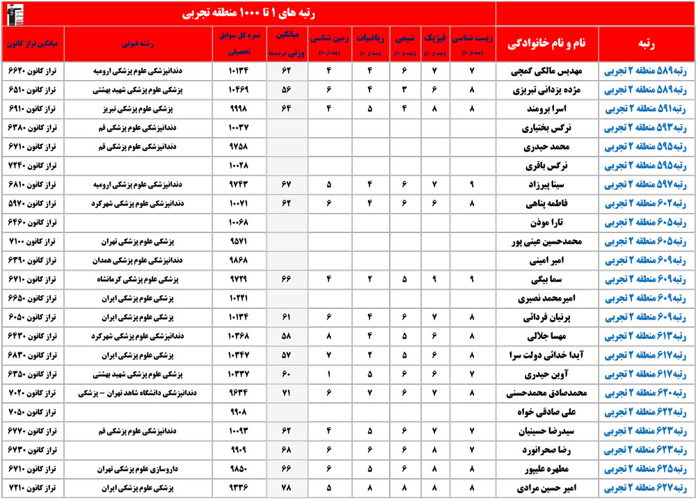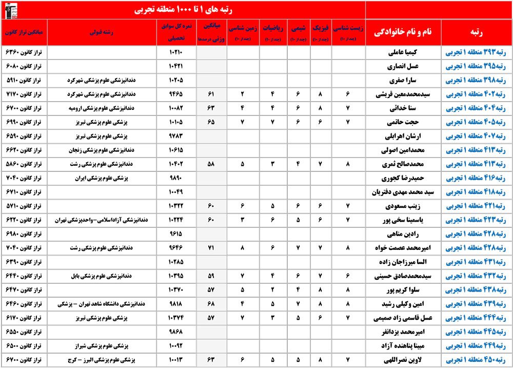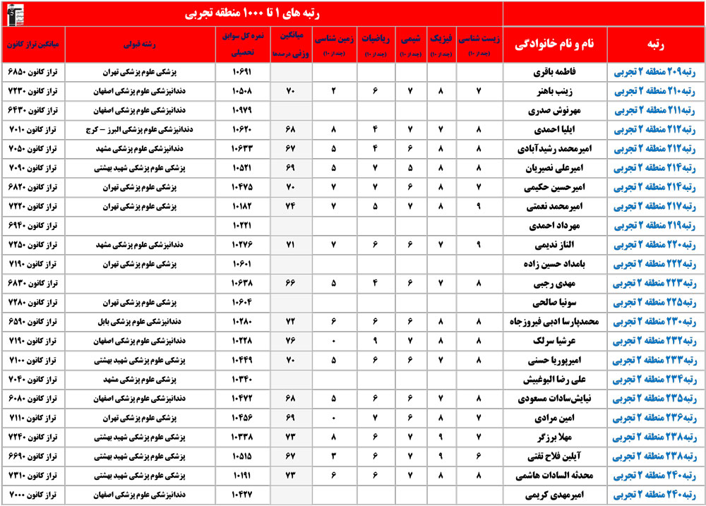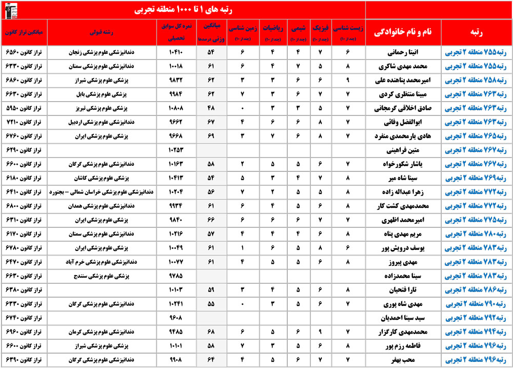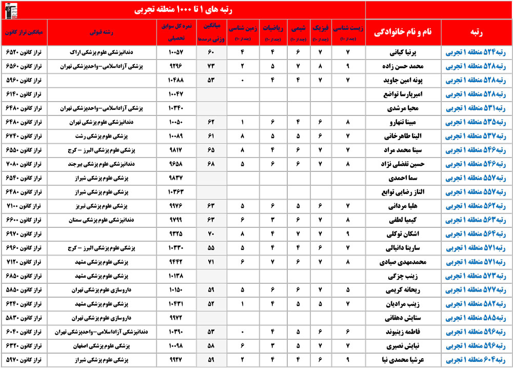 تجربی: رشتههای قبولی رتبههای زیر 1000 منطقه 1، 2 و 3 + درصد ها