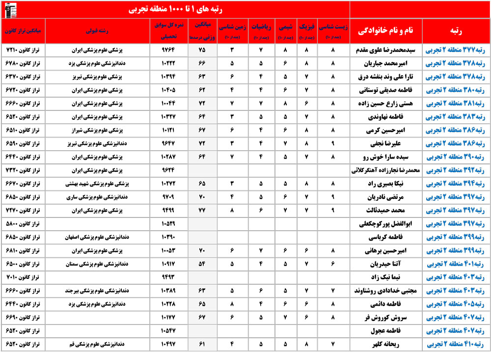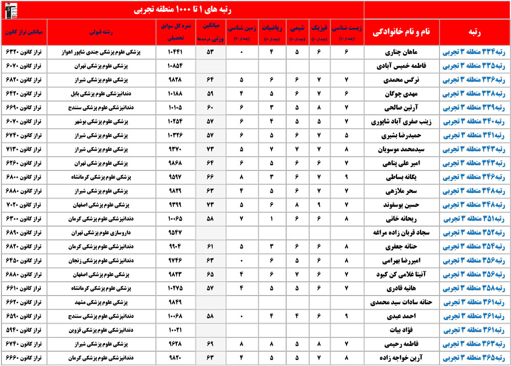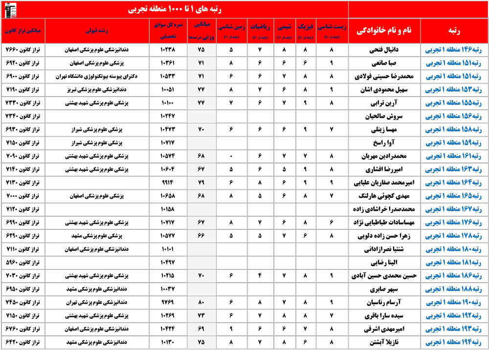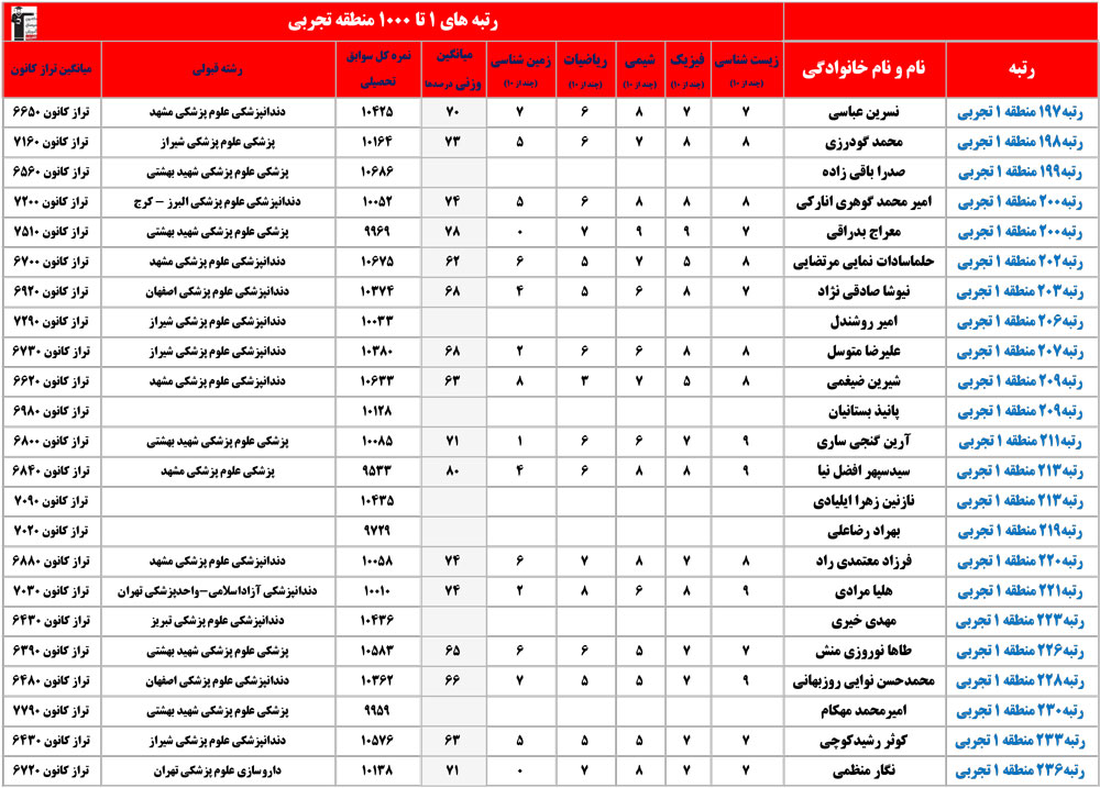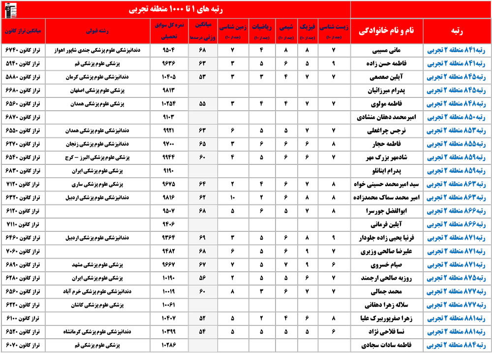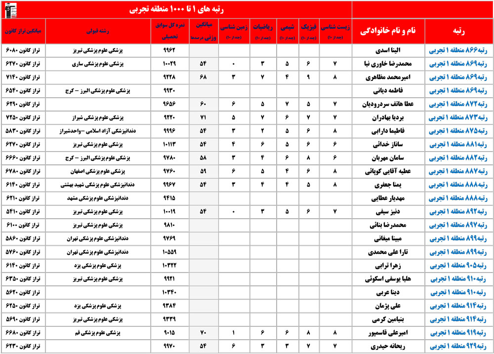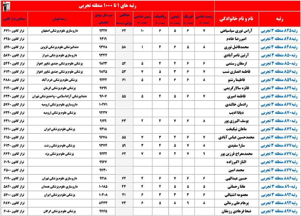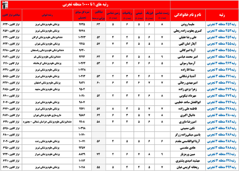 تجربی: رشتههای قبولی رتبههای زیر 1000 منطقه 1، 2 و 3 + درصد ها