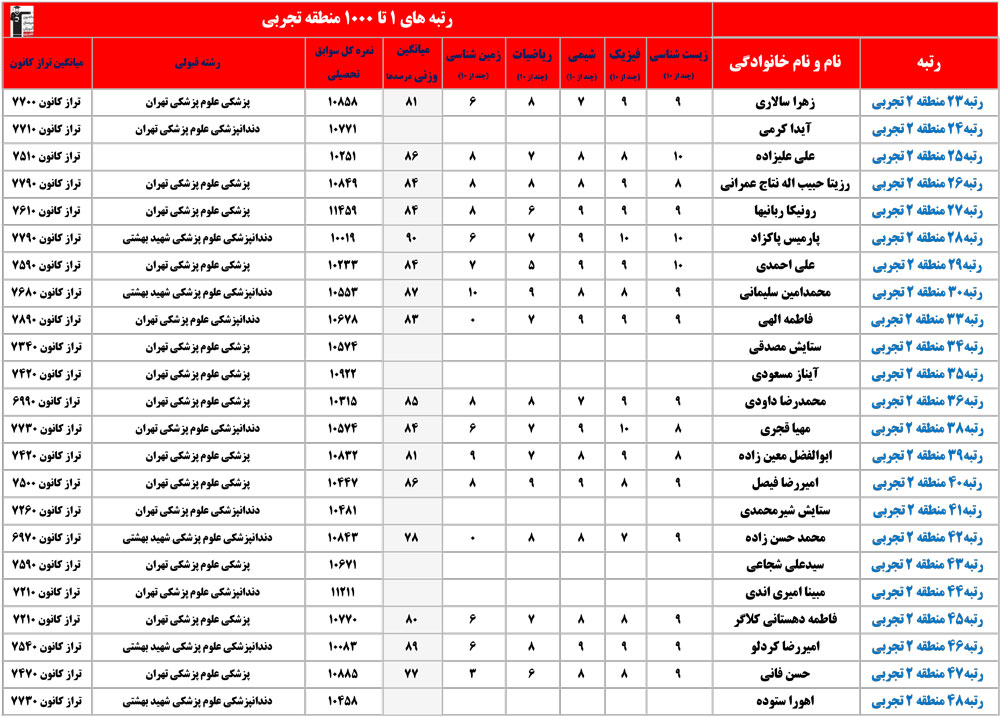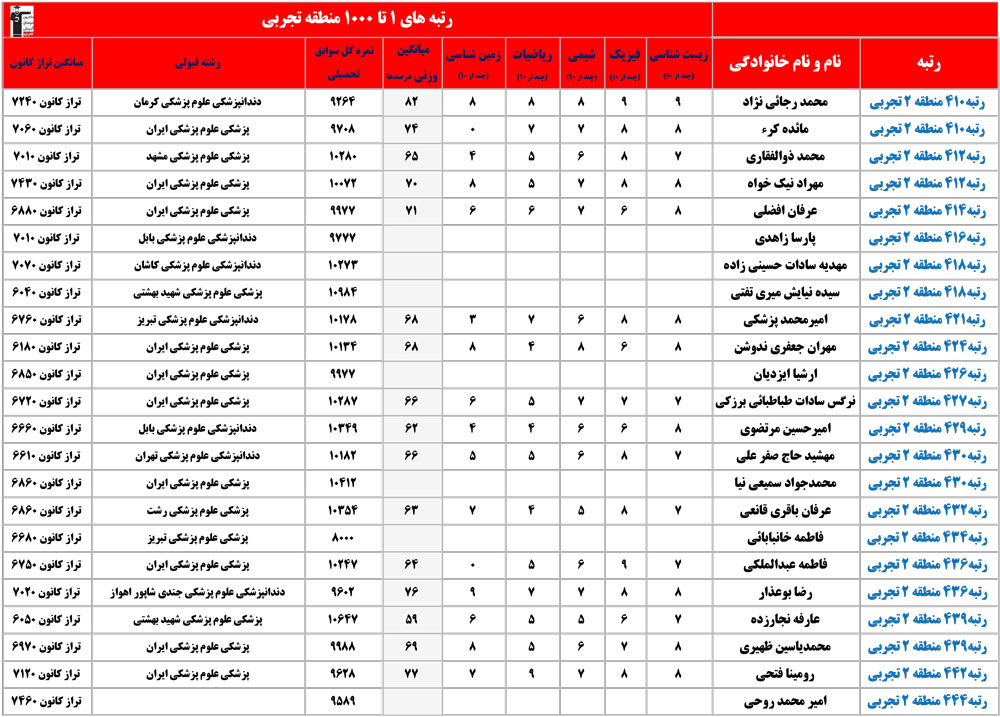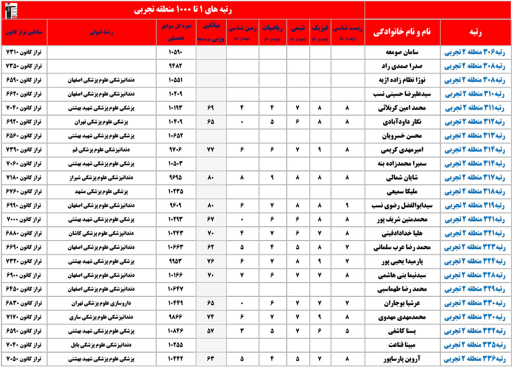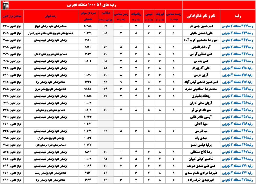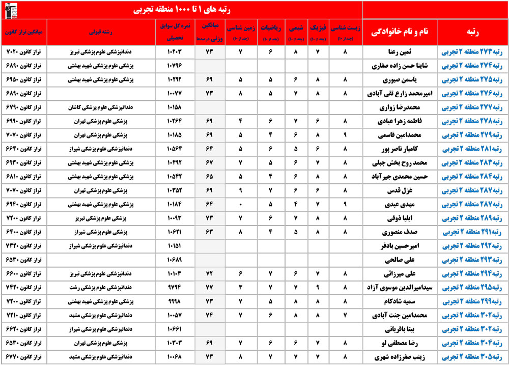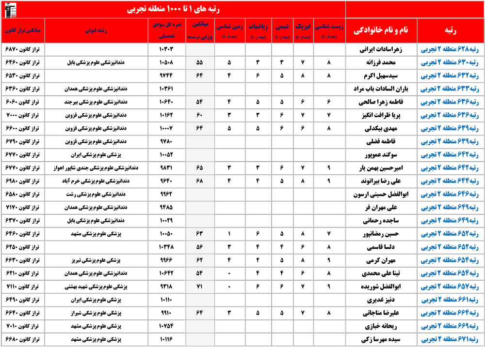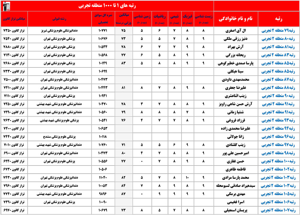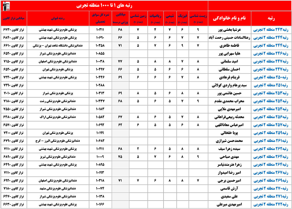 تجربی: رشتههای قبولی رتبههای زیر 1000 منطقه 1، 2 و 3 + درصد ها