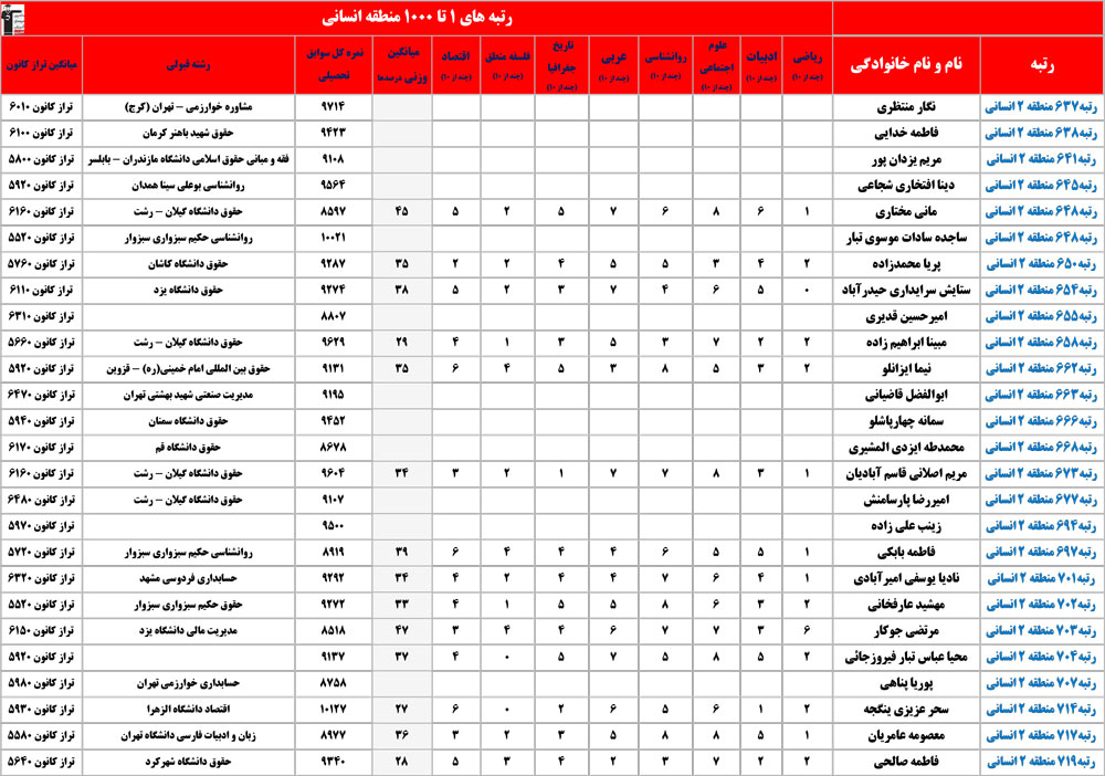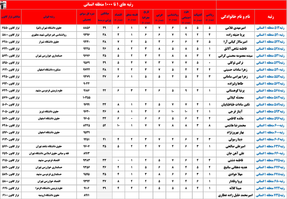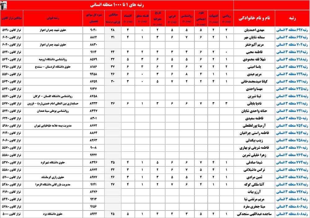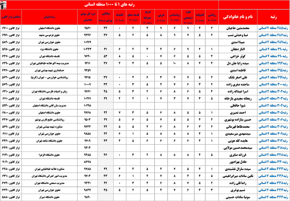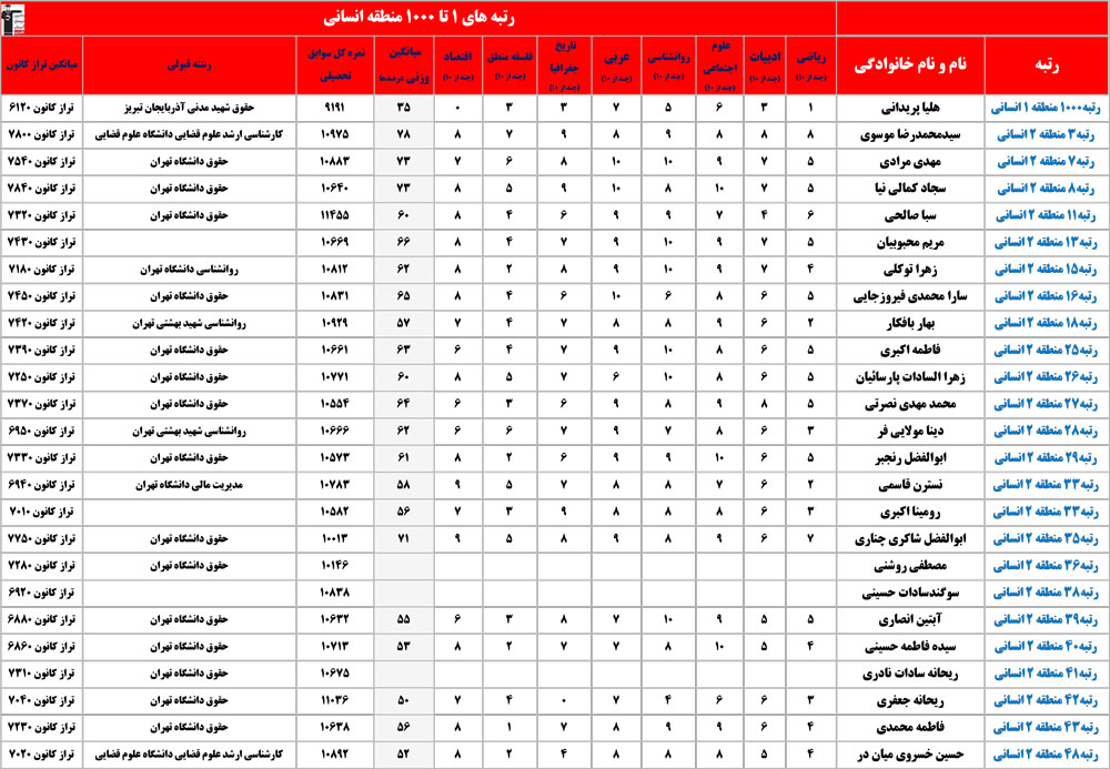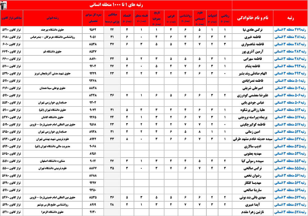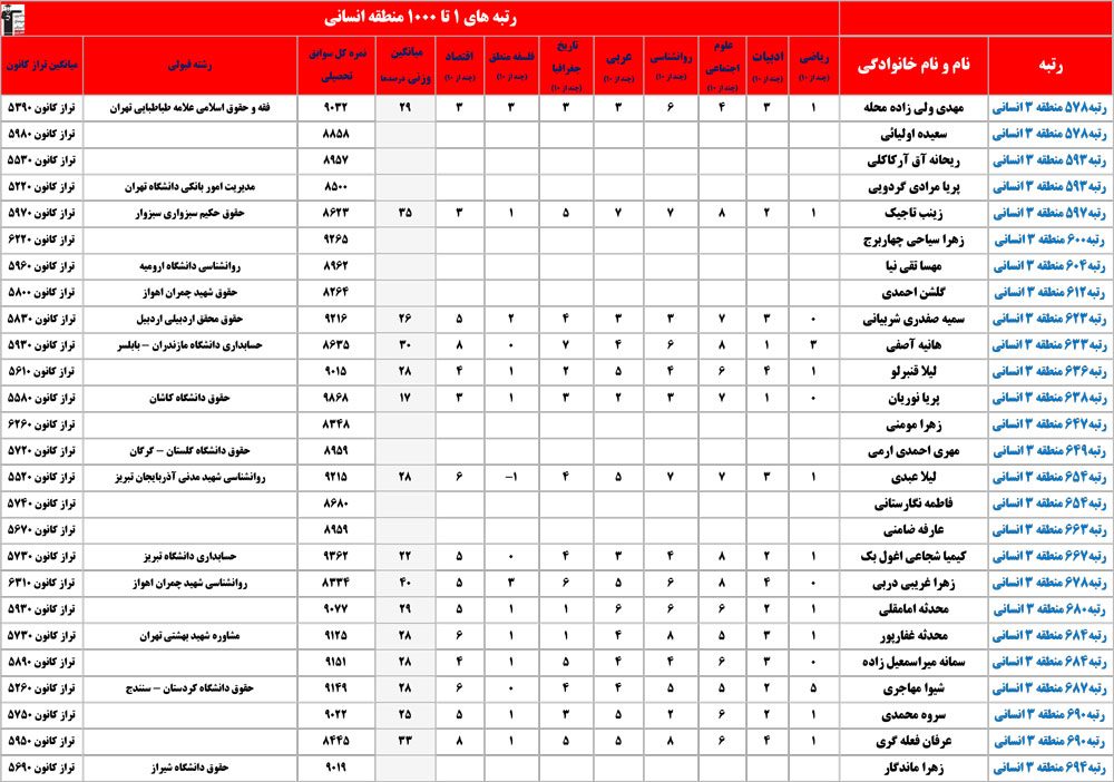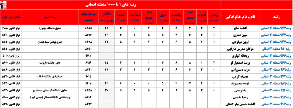 انسانی : رتبه های زیر 1000 منطقه در کنکور 1404 چه درصدهایی داشتند و در کدام رشته و دانشگاه قبول شده اند؟