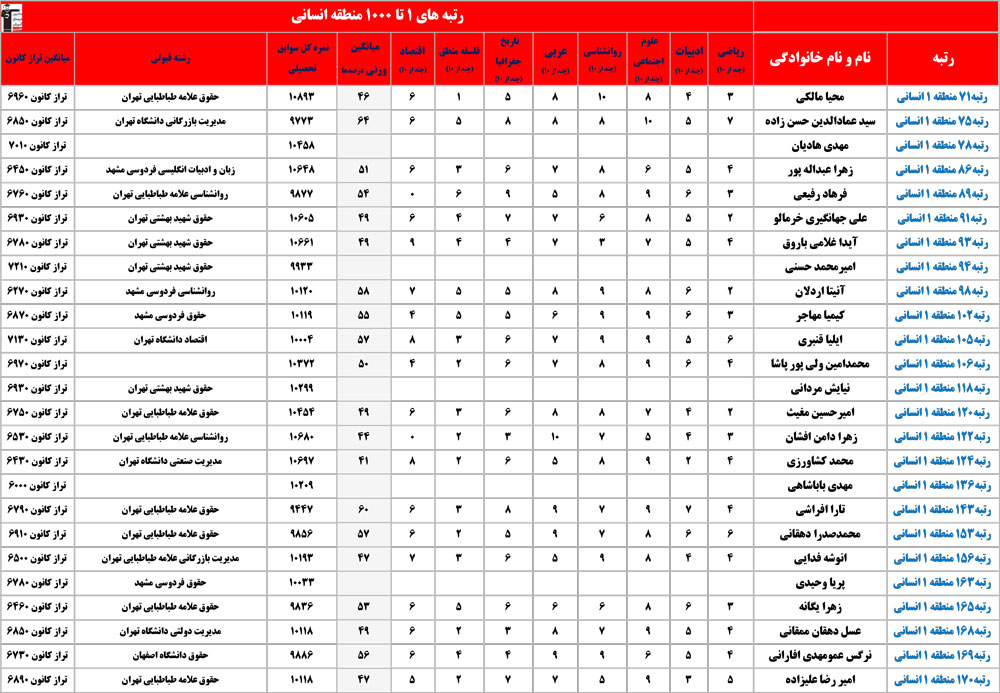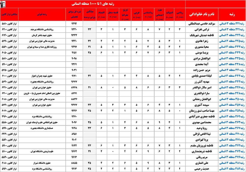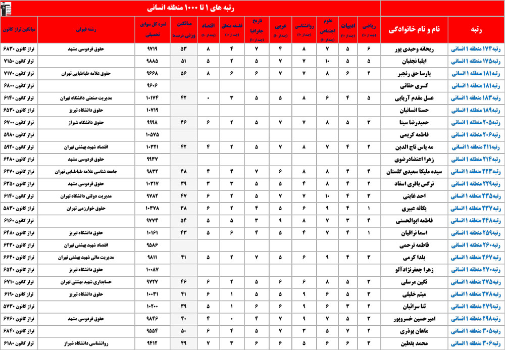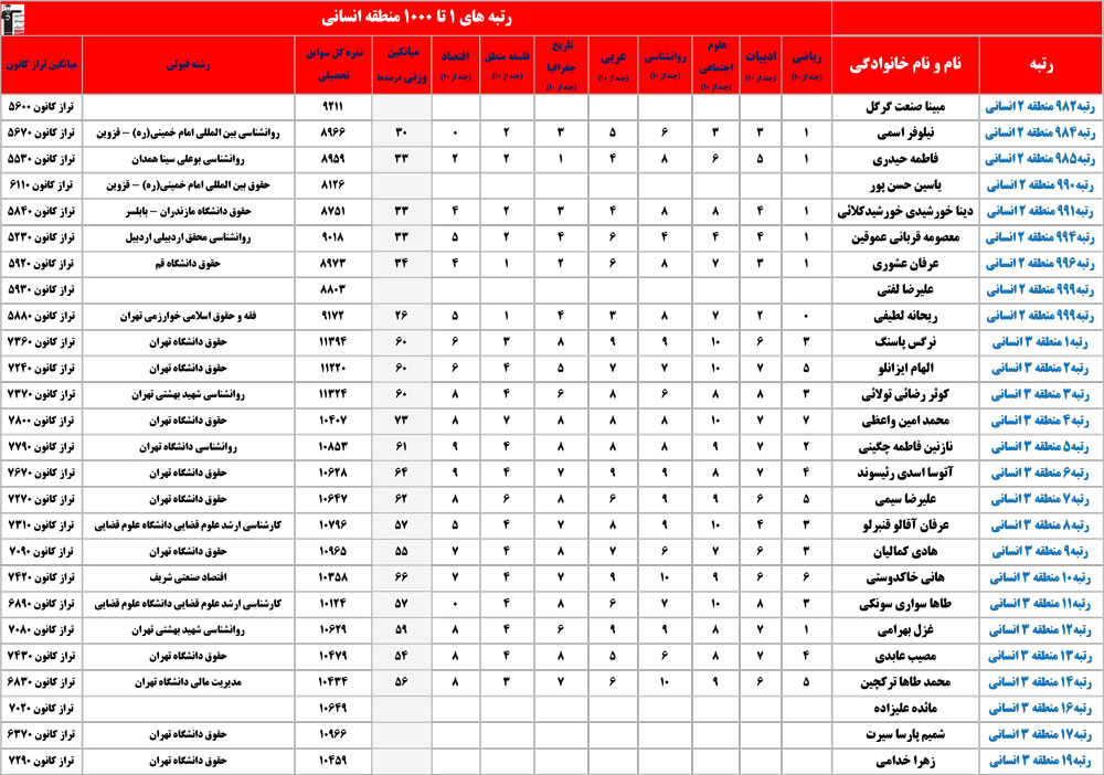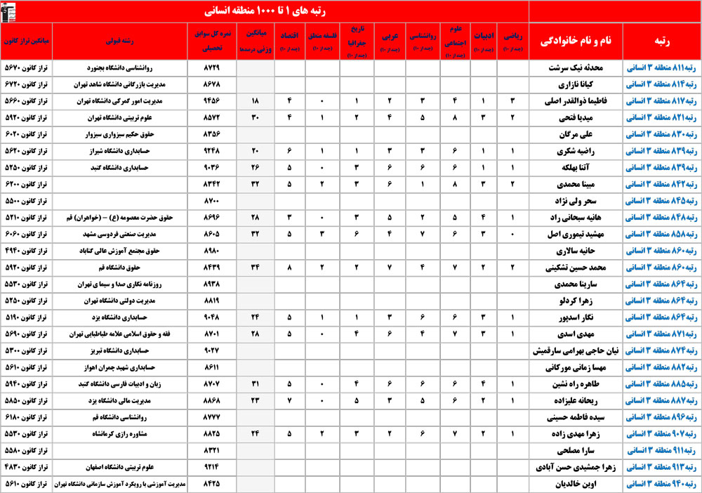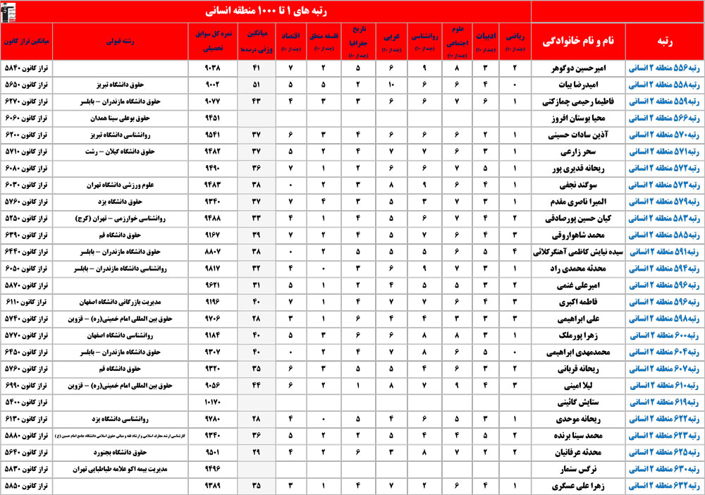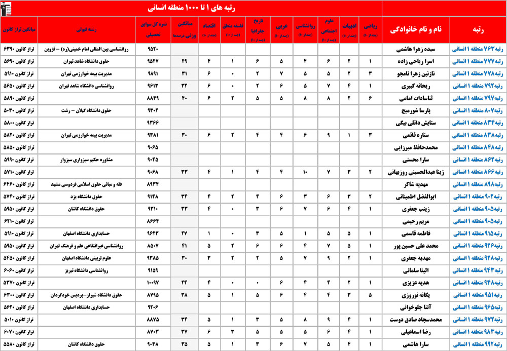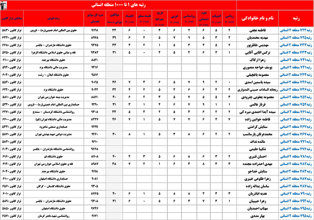 انسانی : رتبه های زیر 1000 منطقه در کنکور 1404 چه درصدهایی داشتند و در کدام رشته و دانشگاه قبول شده اند؟