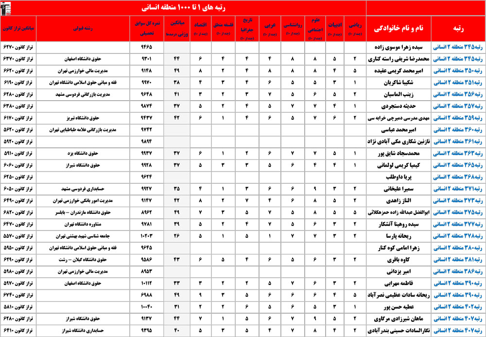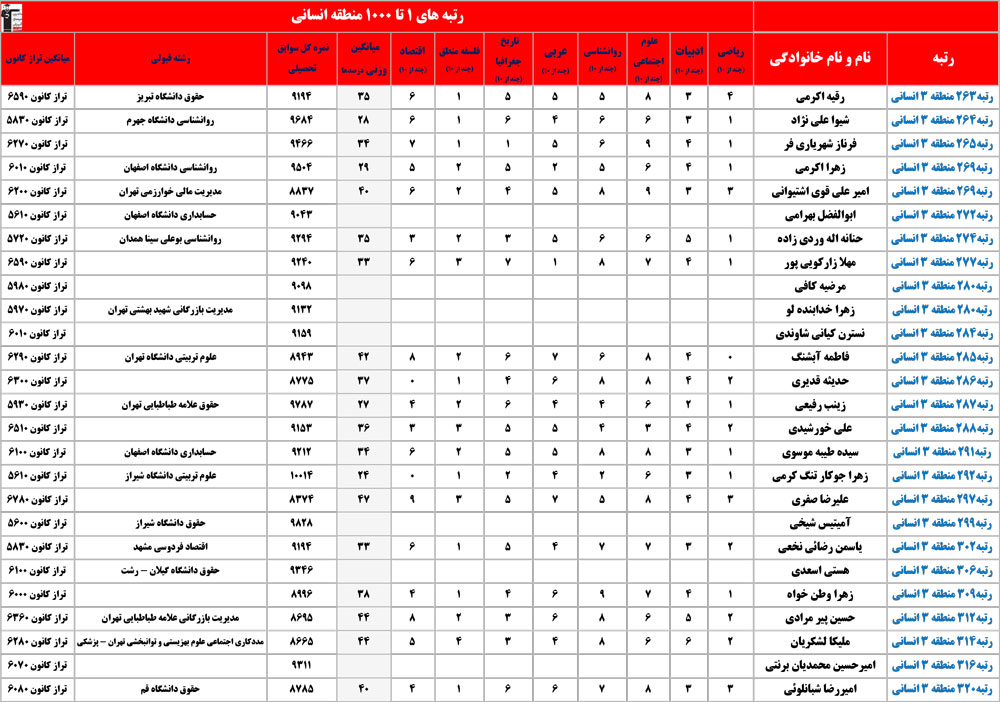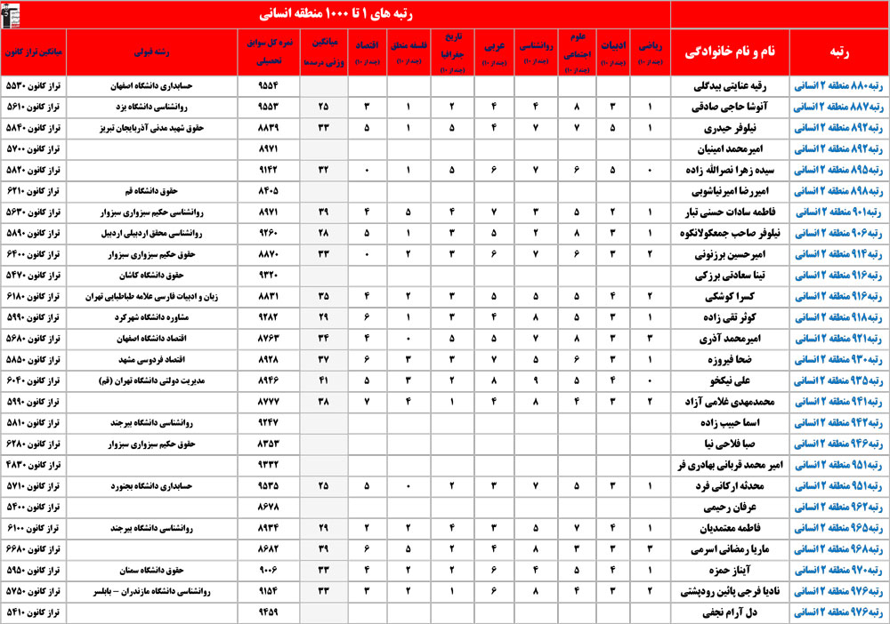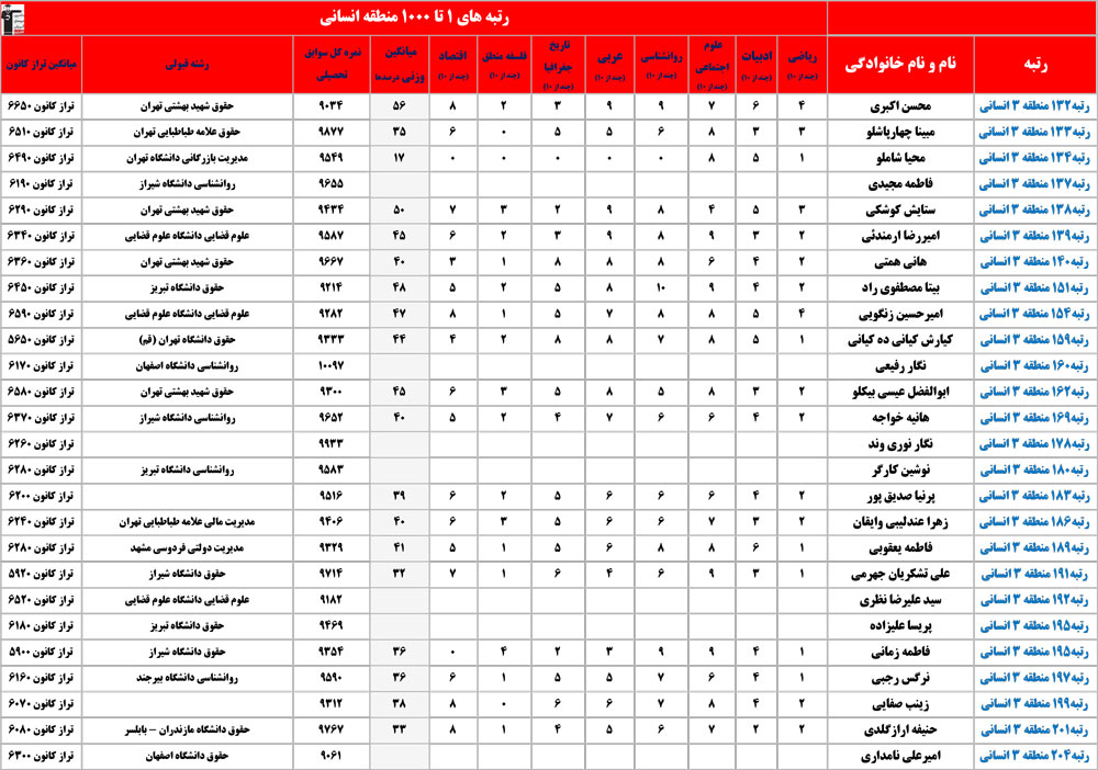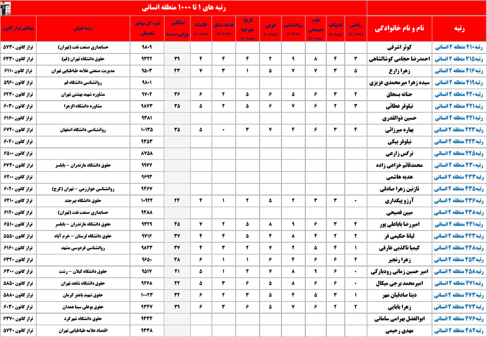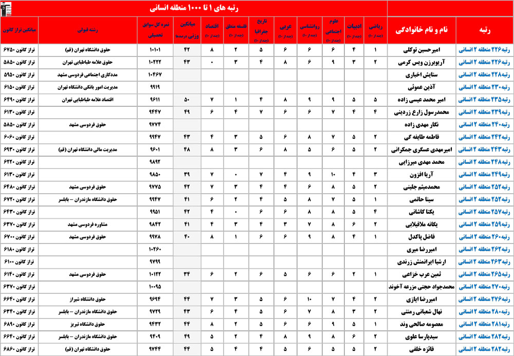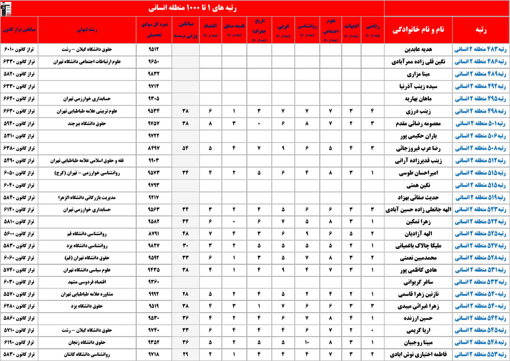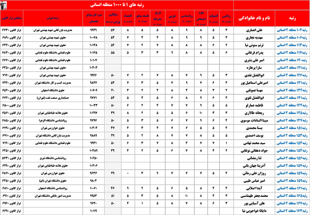 انسانی : رتبه های زیر 1000 منطقه در کنکور 1404 چه درصدهایی داشتند و در کدام رشته و دانشگاه قبول شده اند؟