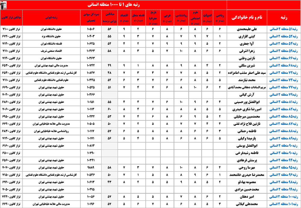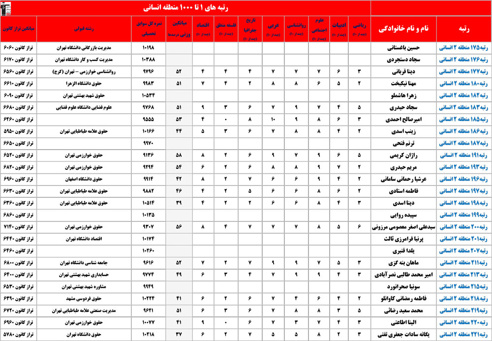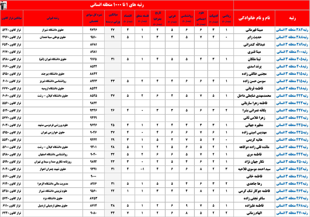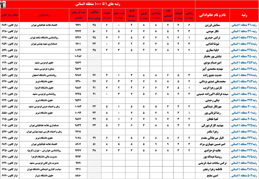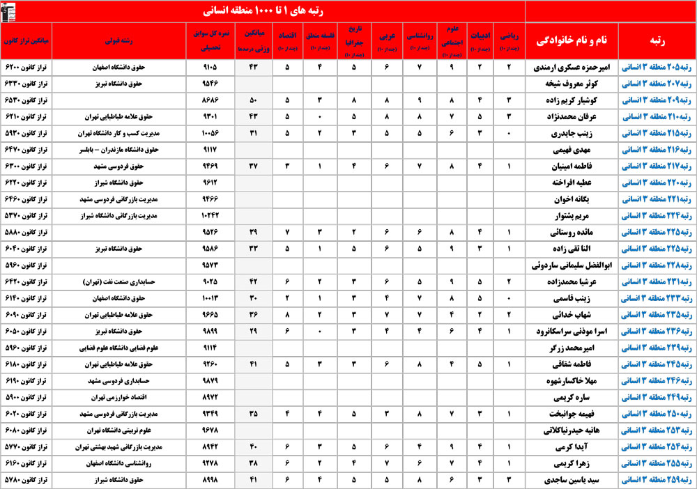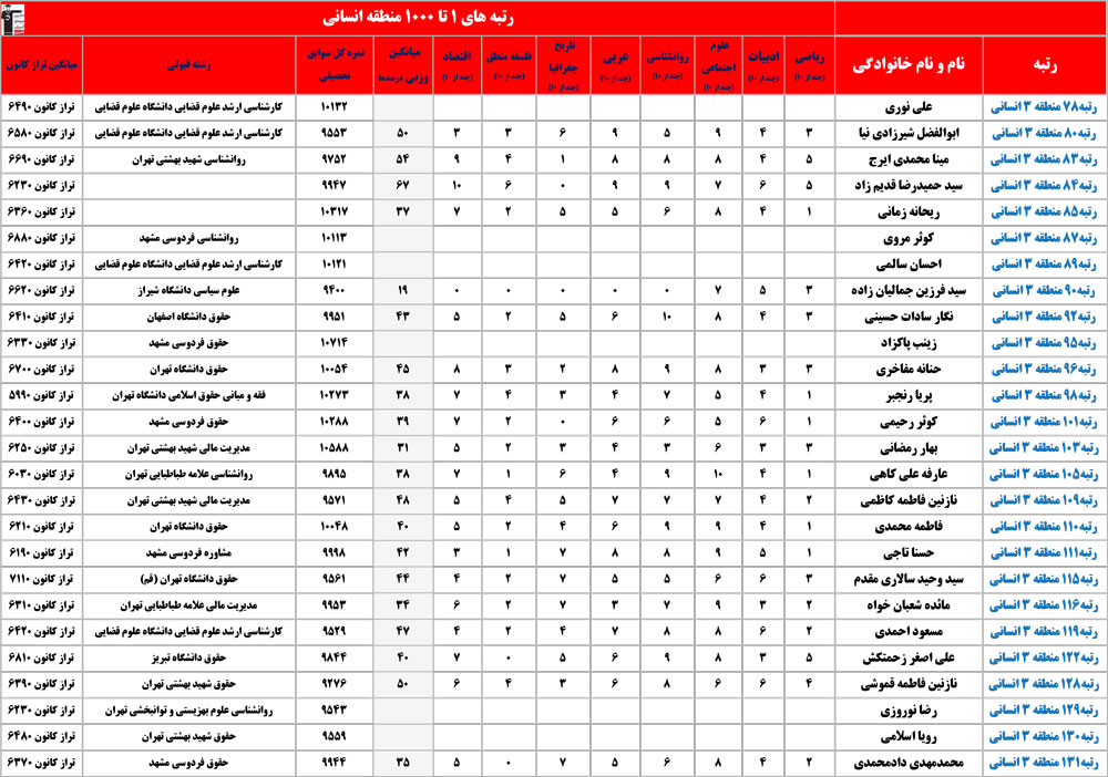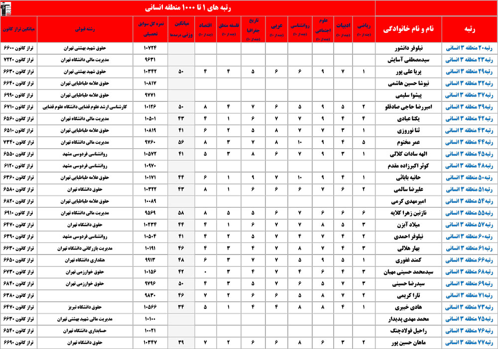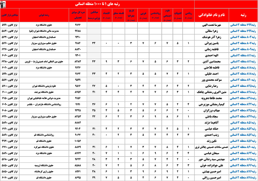 انسانی : رتبه های زیر 1000 منطقه در کنکور 1404 چه درصدهایی داشتند و در کدام رشته و دانشگاه قبول شده اند؟