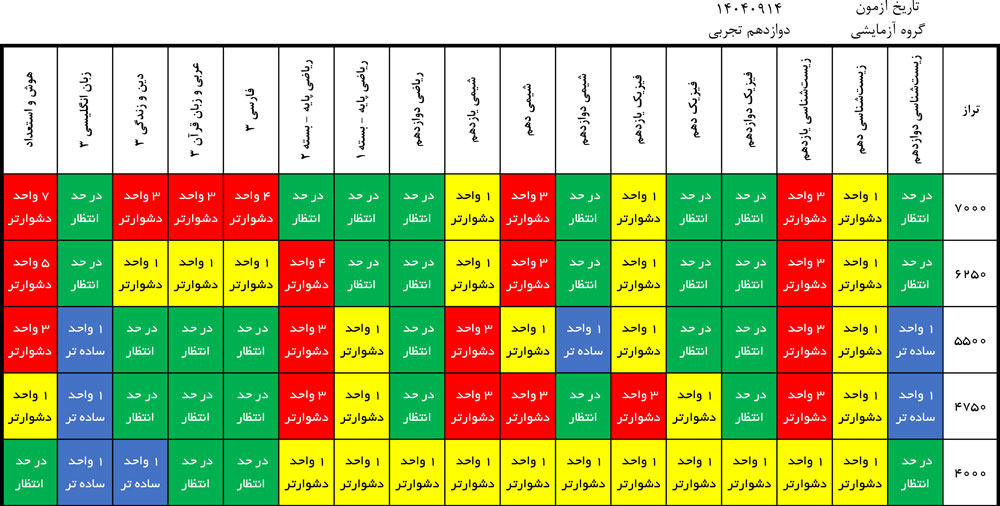 در این جدول برای هر درس رنگ های متفاوتی را می بینید .ممکن است یک درس برای یک بازه ی تراز دشوار و برای بازه ی تراز دیگر متعادل یا ساده باشد . ابتدا نمره ی تراز خود را در نظر بگیرید و سپس رنگ های هر درس را در بازه ی تراز خود ببینید . متوجه می شوید که آیا آن درس برای شما ساده تر از حد انتظار یا دشوارتر بوده یا این که متعادل بوده است .