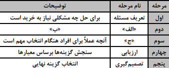 4. ارزیابی : سنجش گزینه ها براساس معیارهای مختلف که اغلب بر اساس جدول خرید مقایسه ای صورت می گیرد. |