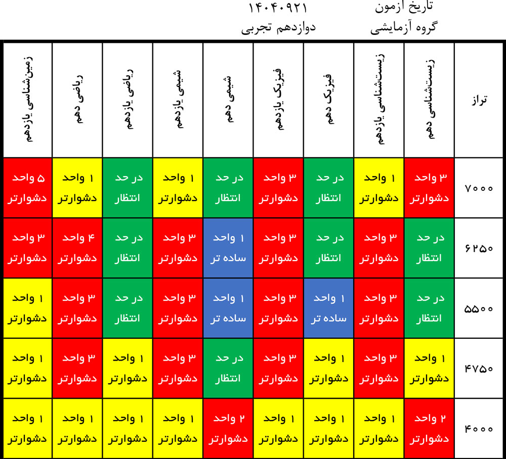 در این جدول برای هر درس رنگ های متفاوتی را می بینید .ممکن است یک درس برای یک بازه ی تراز دشوار و برای بازه ی تراز دیگر متعادل یا ساده باشد . ابتدا نمره ی تراز خود را در نظر بگیرید و سپس رنگ های هر درس را در بازه ی تراز خود ببینید . متوجه می شوید که آیا آن درس برای شما ساده تر از حد انتظار یا دشوارتر بوده یا این که متعادل بوده است .
