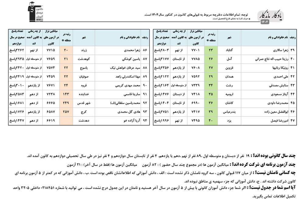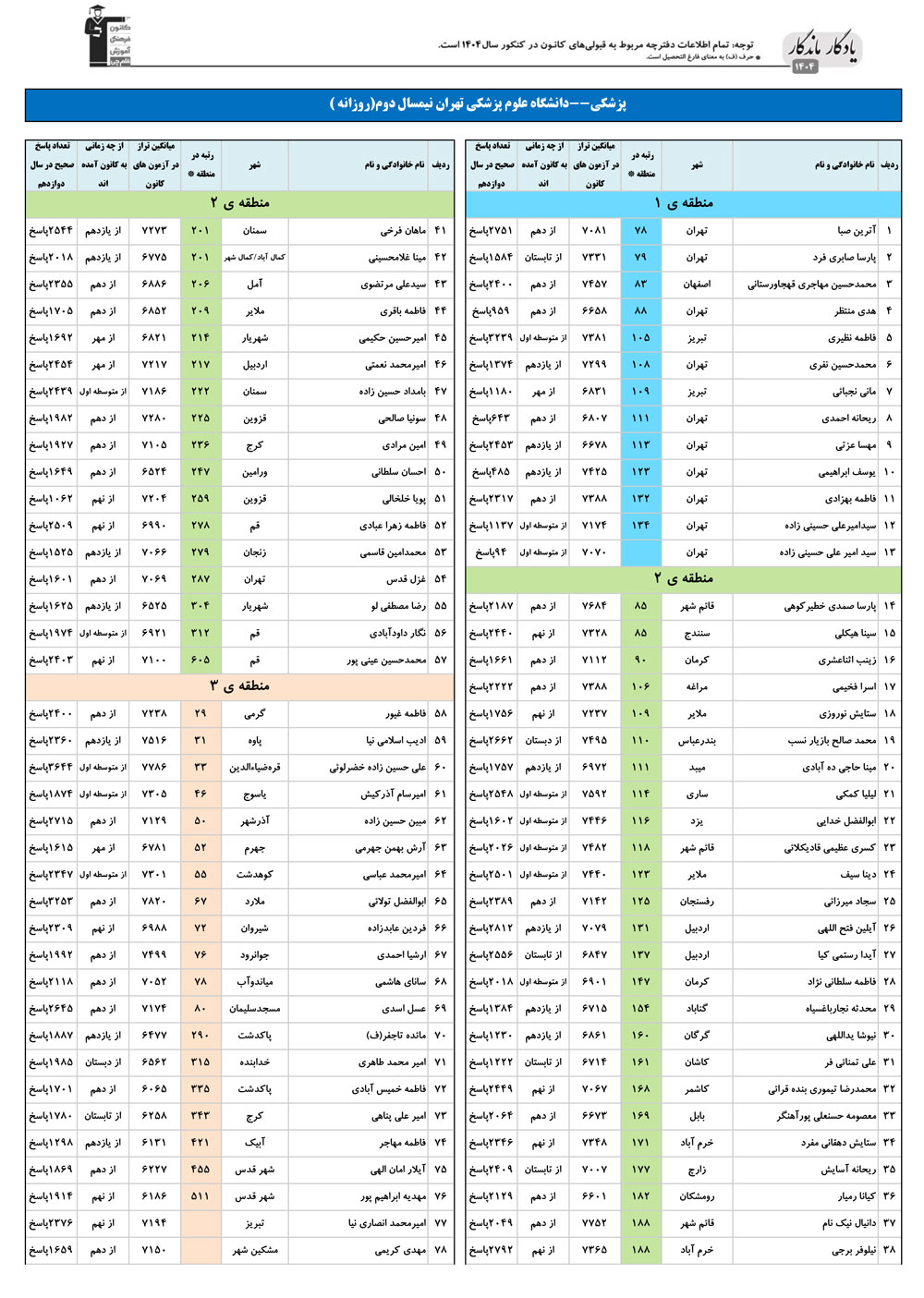یادگار ماندگار : قبولی های کانونی علوم پزشکی تهران در همه رشته ها در سال 1404 را در ادامه مشاهده کنید.فایل با کیفیت قبولی های سال 1404 را در قسمت فایل های ضمیمه دانلود کنید.