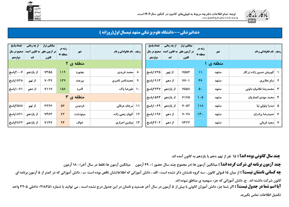 یادگار ماندگار : قبولی های کانونی دانشگاه علوم پزشکی مشهد در همه رشته ها در سال 1404 را در ادامه مشاهده کنید.فایل با کیفیت قبولی های سال 1404 را در قسمت فایل های ضمیمه دانلود کنید.
