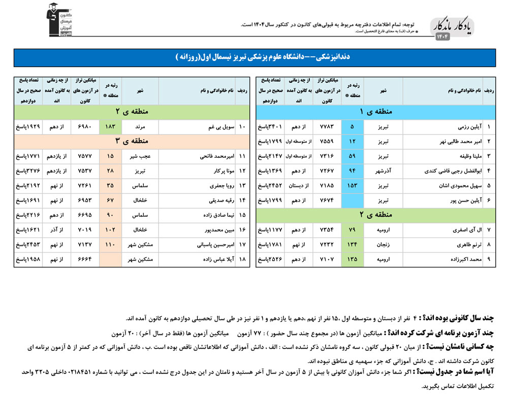 یادگار ماندگار : قبولی های کانونی دانشگاه علوم پزشکی تبریز در همه رشته ها در سال 1404 را در ادامه مشاهده کنید.فایل با کیفیت قبولی های سال 1404 را در قسمت فایل های ضمیمه دانلود کنید.