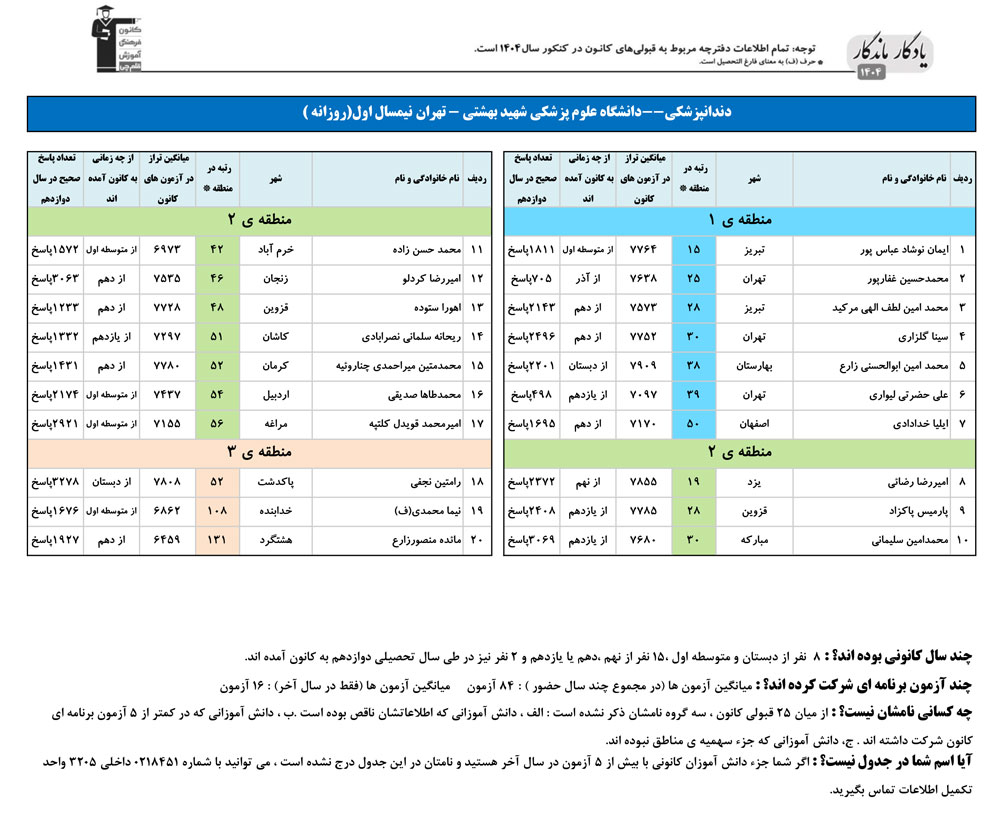 یادگار ماندگار : قبولی های کانونی دانشگاه علوم پزشکی شهید بهشتی تهران در همه رشته ها در سال 1404 را در ادامه مشاهده کنید.فایل با کیفیت قبولی های سال 1404 را در قسمت فایل های ضمیمه دانلود کنید.