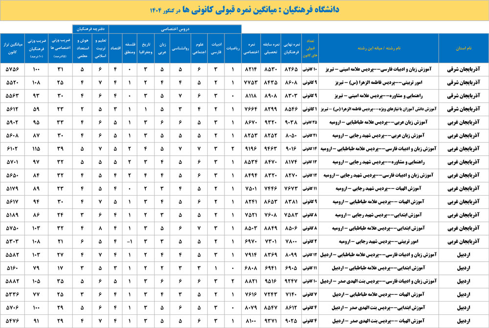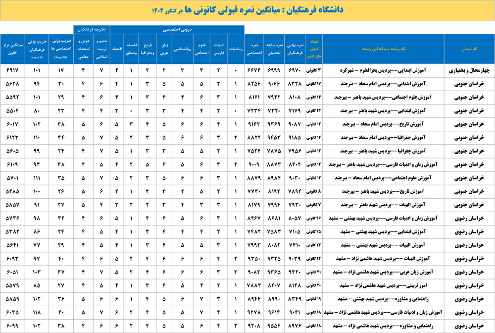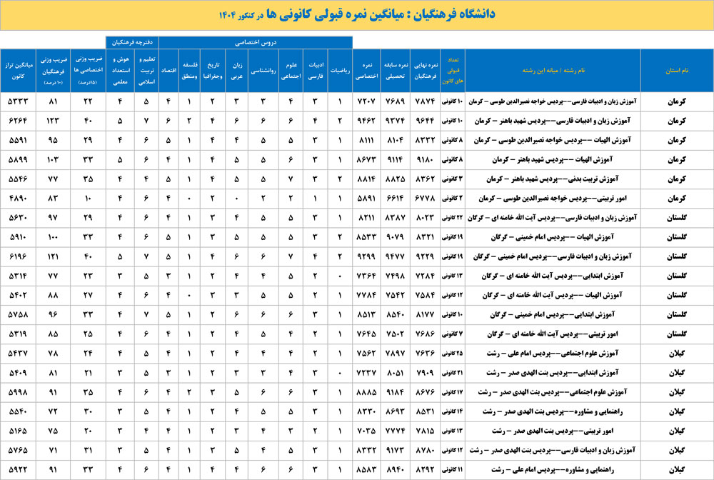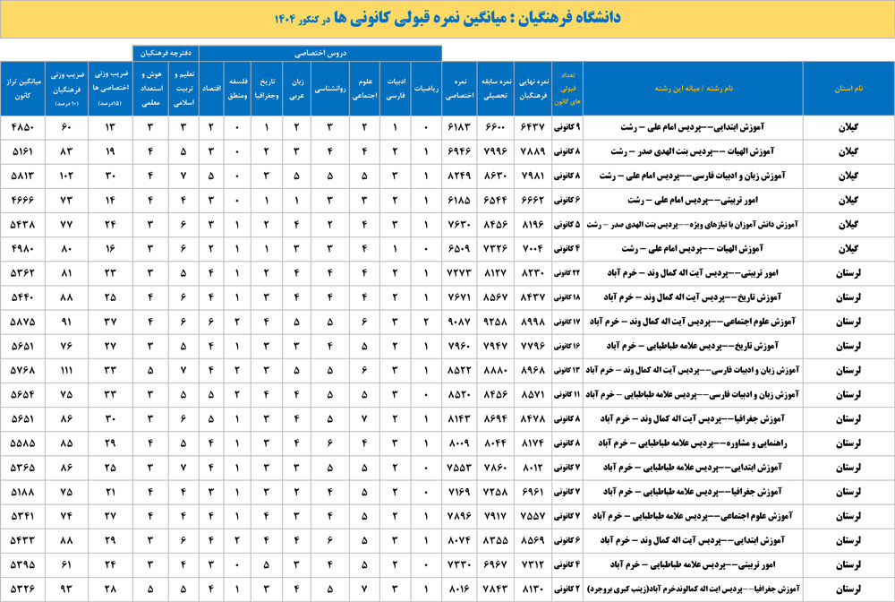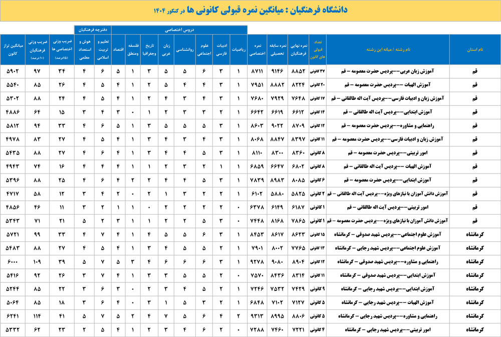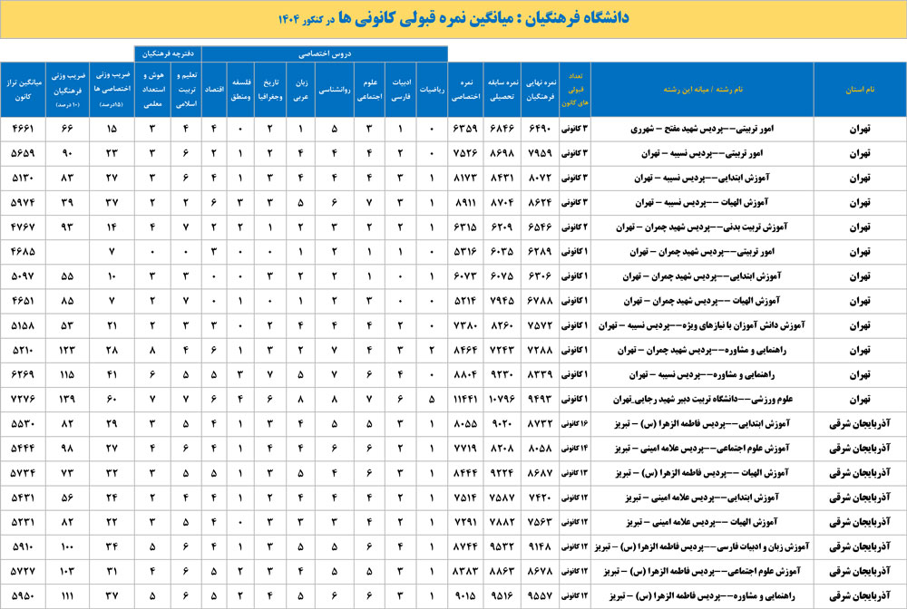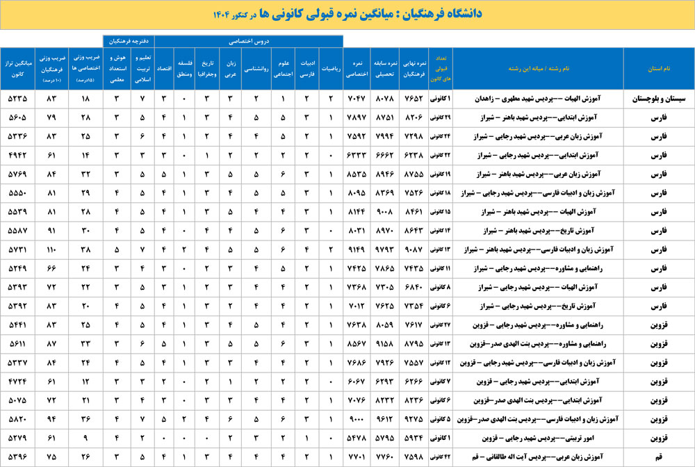 دانشگاه فرهنگیان : میانگین نمره قبولی کانونی ها در کنکور 1404