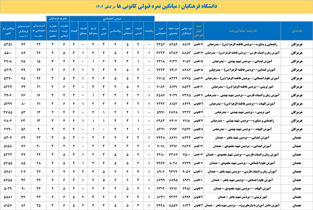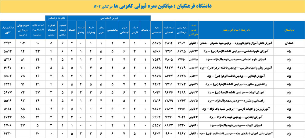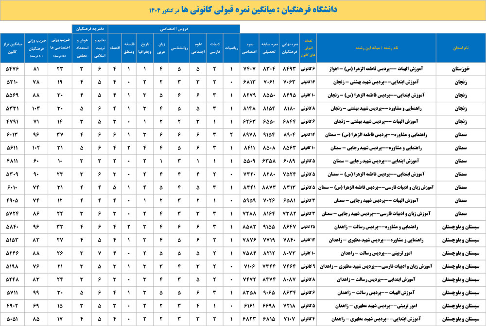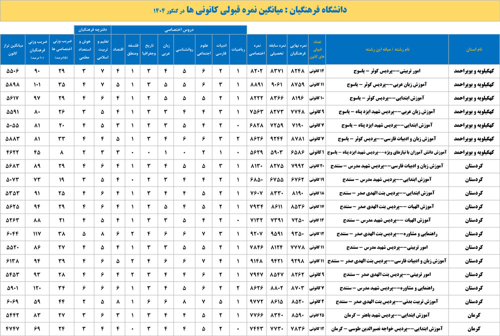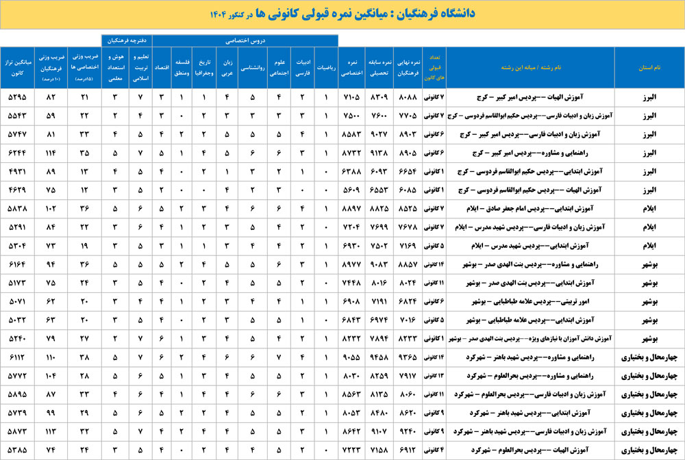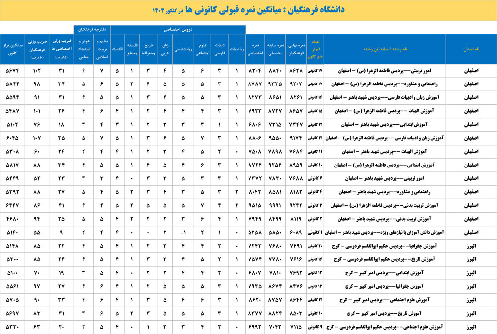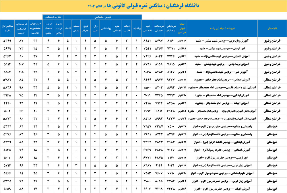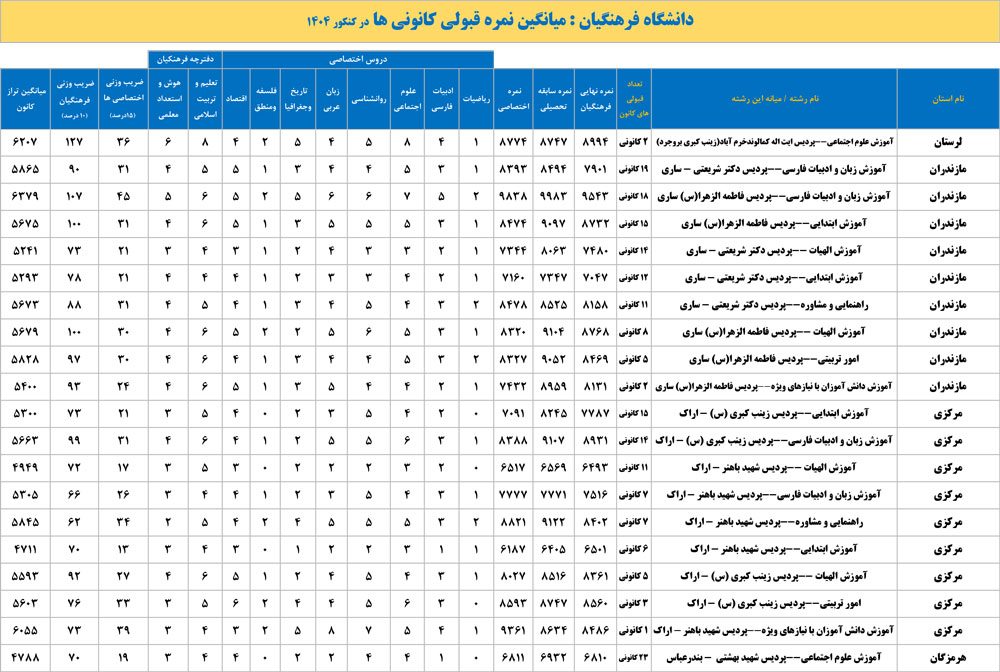 دانشگاه فرهنگیان : میانگین نمره قبولی کانونی ها در کنکور 1404