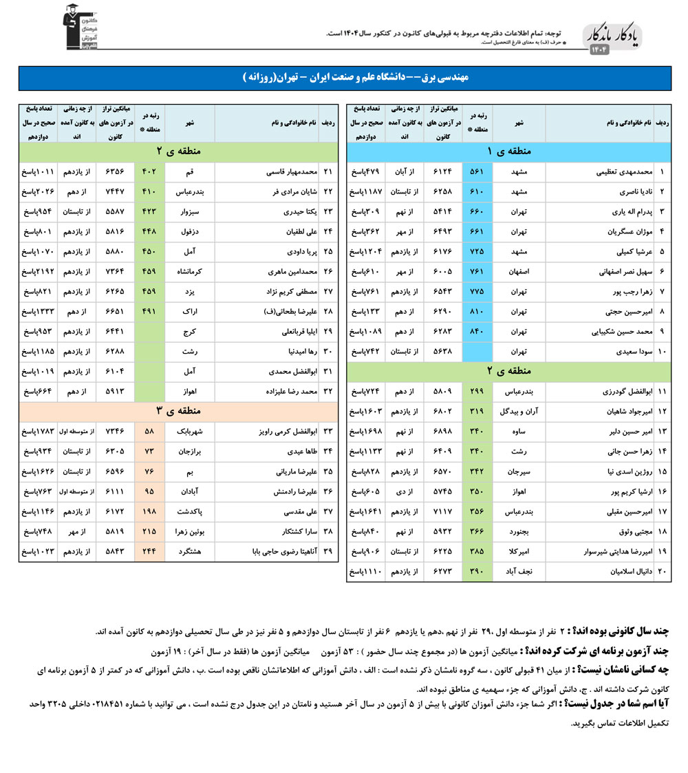 یادگار ماندگار : قبولی های کانونی دانشگاه علم و صنعت ایران در همه رشته ها در سال 1404 را در ادامه مشاهده کنید.فایل با کیفیت قبولی های سال 1404 را در قسمت فایل های ضمیمه دانلود کنید.