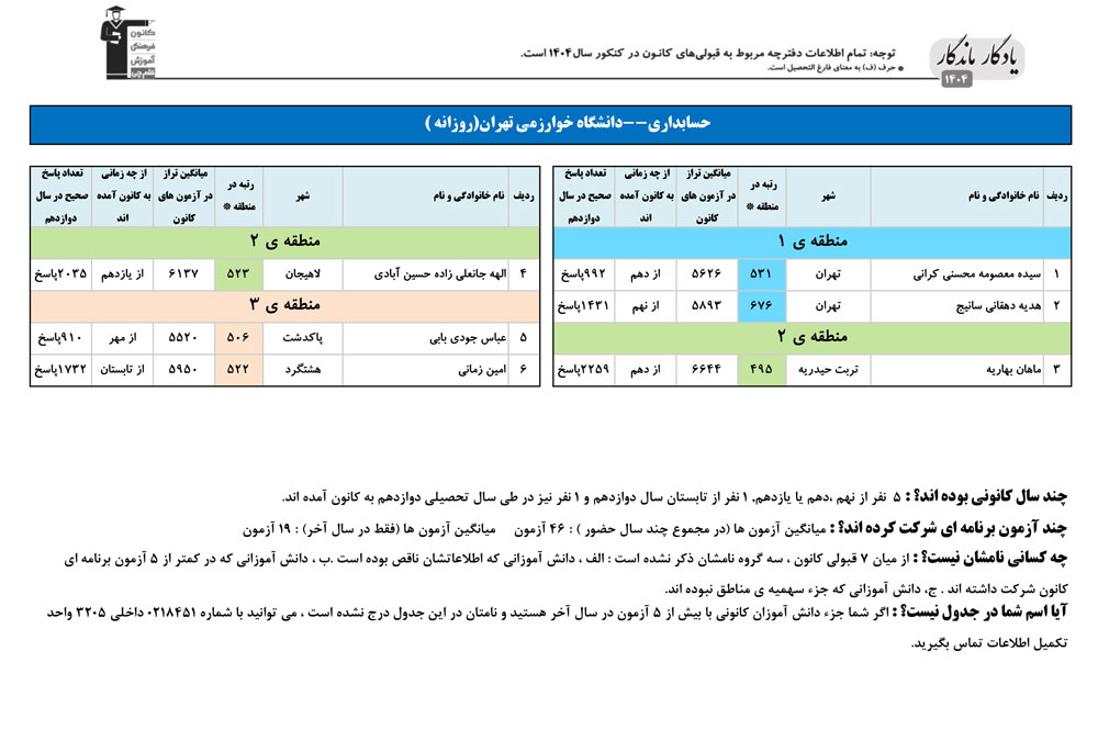 یادگار ماندگار : قبولی های کانونی دانشگاه خوارزمی تهران در همه رشته ها در سال 1404 را در ادامه مشاهده کنید.فایل با کیفیت قبولی های سال 1404 را در قسمت فایل های ضمیمه دانلود کنید.