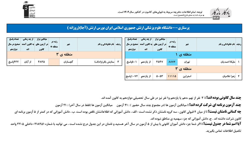 یادگار ماندگار : قبولی های کانونی دانشگاه علوم پزشکي ارتش تهران در همه رشته ها در سال 1404 را در ادامه مشاهده کنید.فایل با کیفیت قبولی های سال 1404 را در قسمت فایل های ضمیمه دانلود کنید.