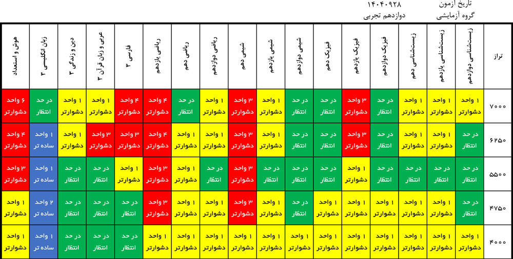 در این جدول برای هر درس رنگ های متفاوتی را می بینید .ممکن است یک درس برای یک بازه ی تراز دشوار و برای بازه ی تراز دیگر متعادل یا ساده باشد . ابتدا نمره ی تراز خود را در نظر بگیرید و سپس رنگ های هر درس را در بازه ی تراز خود ببینید . متوجه می شوید که آیا آن درس برای شما ساده تر از حد انتظار یا دشوارتر بوده یا این که متعادل بوده است .