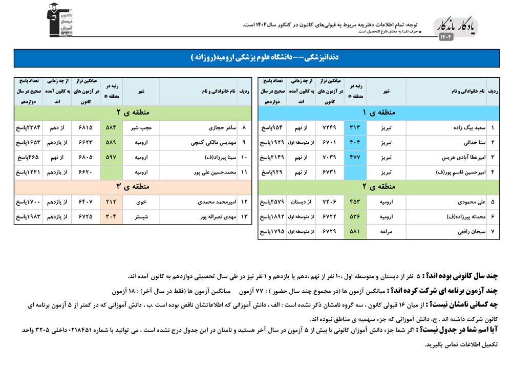 یادگار ماندگار : قبولی های کانونی دانشگاه علوم پزشکي اروميه در همه رشته ها در سال 1404 را در ادامه مشاهده کنید.فایل با کیفیت قبولی های سال 1404 را در قسمت فایل های ضمیمه دانلود کنید.