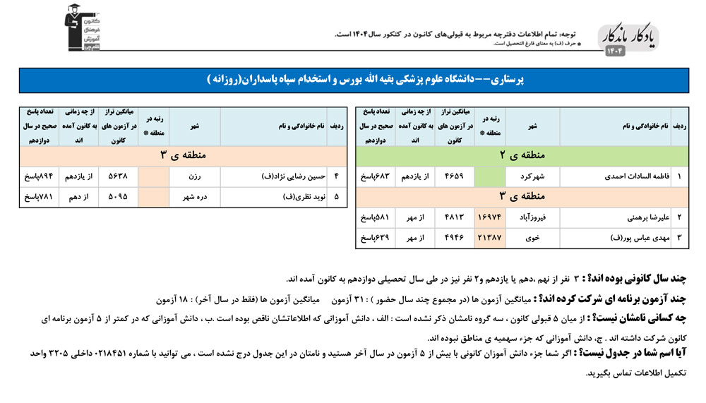 یادگار ماندگار : قبولی های کانونی دانشگاه علوم پزشکي بقيه الله تهران در همه رشته ها در سال 1404 را در ادامه مشاهده کنید.فایل با کیفیت قبولی های سال 1404 را در قسمت فایل های ضمیمه دانلود کنید.