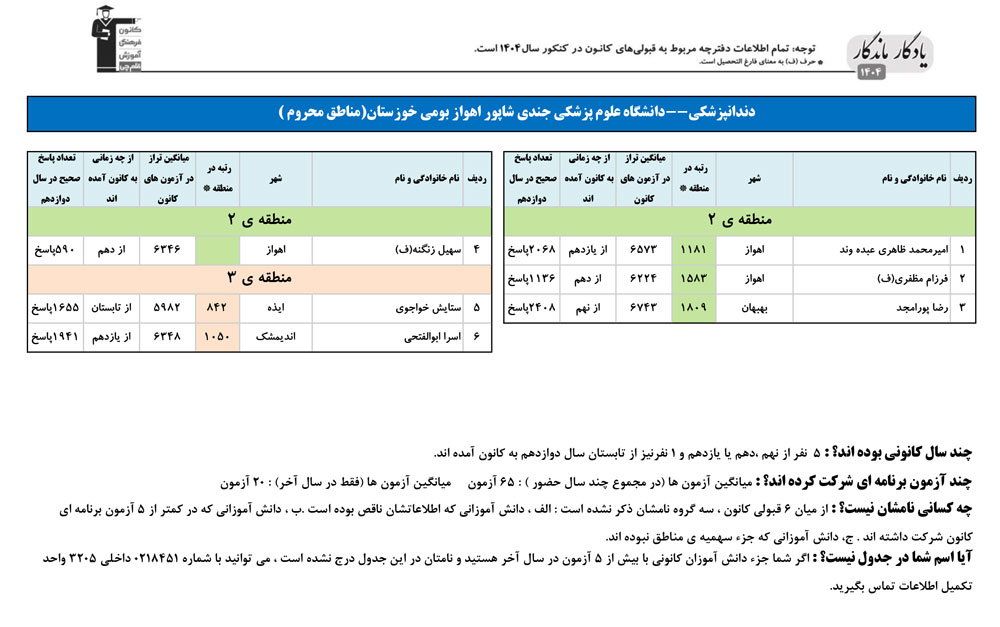 یادگار ماندگار : قبولی های کانونی دانشگاه علوم پزشکي جندي شاپور اهواز در همه رشته ها در سال 1404 را در ادامه مشاهده کنید.فایل با کیفیت قبولی های سال 1404 را در قسمت فایل های ضمیمه دانلود کنید.