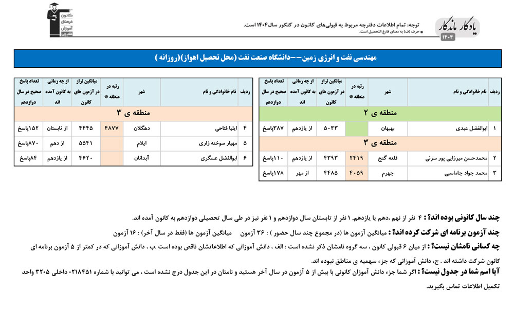 یادگار ماندگار : قبولی های کانونی دانشگاه صنعت نفت اهواز در همه رشته ها در سال 1404 را در ادامه مشاهده کنید.فایل با کیفیت قبولی های سال 1404 را در قسمت فایل های ضمیمه دانلود کنید.