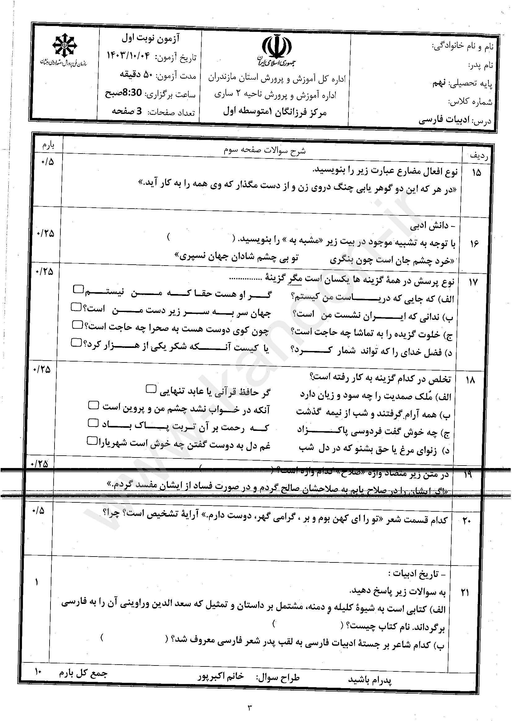 ما یک نمونه سوال در اینجا قرار دادیم تا با استاندارد آزمونها آشنا شوید. برای دسترسی به تمام نمونه سوالات نوبت اول روی عکس زیر کلیک کنید