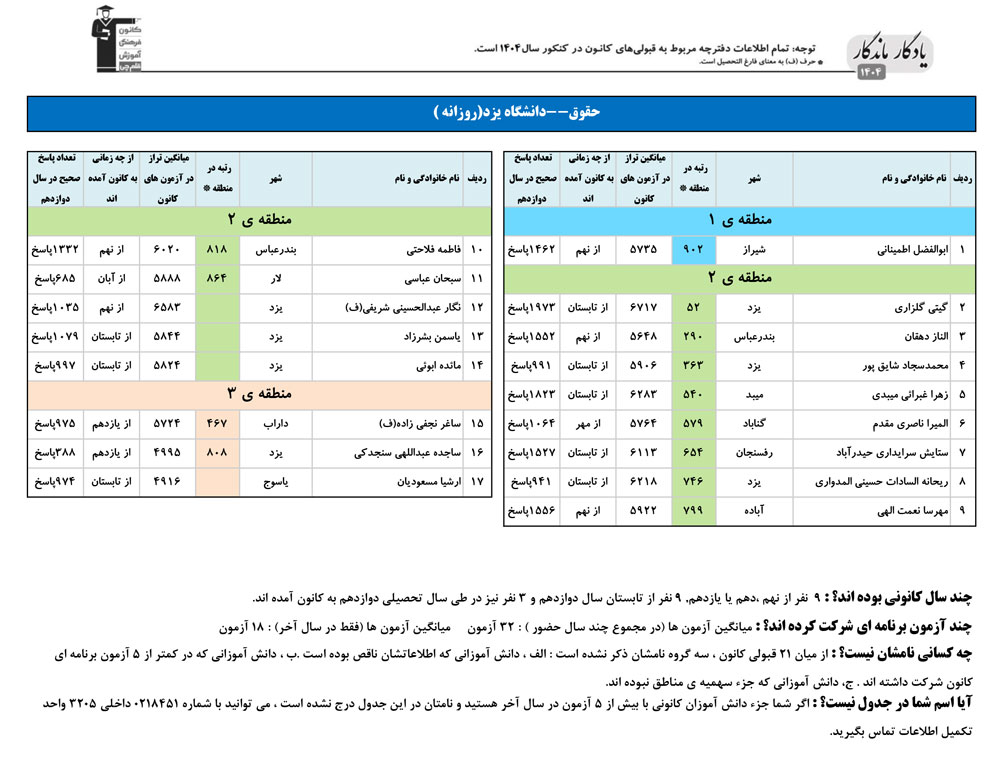 یادگار ماندگار : قبولی های کانونی دانشگاه یزد در همه رشته ها در سال 1404 را در ادامه مشاهده کنید.فایل با کیفیت قبولی های سال 1404 را در قسمت فایل های ضمیمه دانلود کنید.