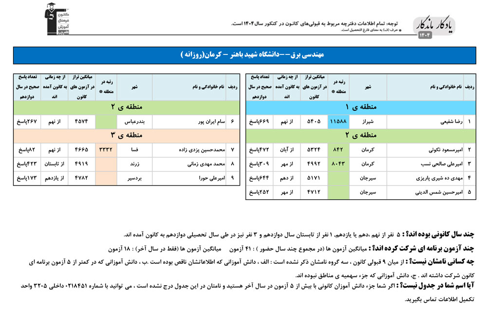 یادگار ماندگار : قبولی های کانونی دانشگاه شهید باهنر کرمان در همه رشته ها در سال 1404 را در ادامه مشاهده کنید.فایل با کیفیت قبولی های سال 1404 را در قسمت فایل های ضمیمه دانلود کنید.