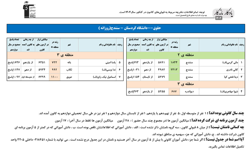 یادگار ماندگار : قبولی های کانونی دانشگاه کردستان سنندج در همه رشته ها در سال 1404 را در ادامه مشاهده کنید.فایل با کیفیت قبولی های سال 1404 را در قسمت فایل های ضمیمه دانلود کنید.