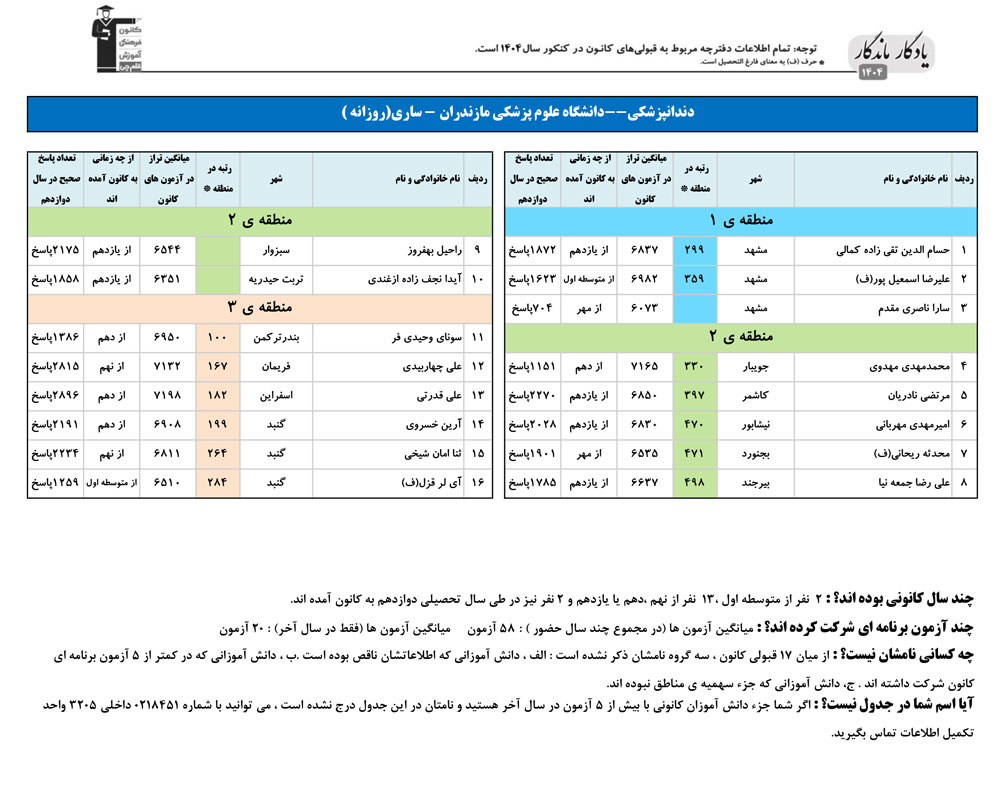 یادگار ماندگار : قبولی های کانونی دانشگاه علوم پزشکی مازندران ساری در همه رشته ها در سال 1404 را در ادامه مشاهده کنید.فایل با کیفیت قبولی های سال 1404 را در قسمت فایل های ضمیمه دانلود کنید.