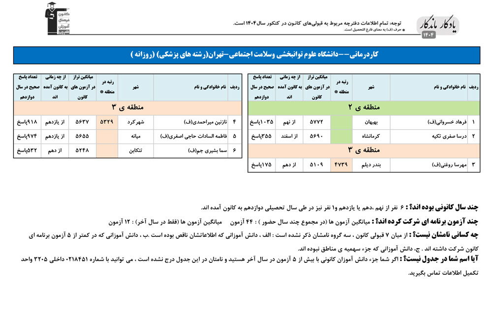 یادگار ماندگار : قبولی های کانونی دانشگاه علوم توانبخشی در همه رشته ها در سال 1404 را در ادامه مشاهده کنید.فایل با کیفیت قبولی های سال 1404 را در قسمت فایل های ضمیمه دانلود کنید.