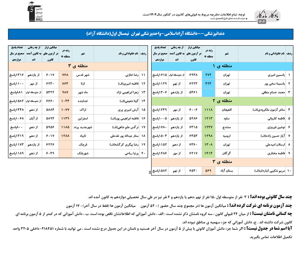 یادگار ماندگار : قبولی های کانونی دانشگاه های علوم پزشکی آزاد در همه رشته ها در سال 1404 را در ادامه مشاهده کنید.فایل با کیفیت قبولی های سال 1404 را در قسمت فایل های ضمیمه دانلود کنید.