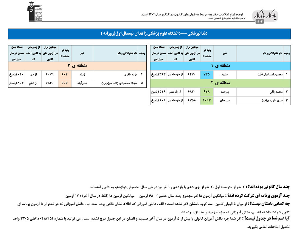 یادگار ماندگار : قبولی های کانونی دانشگاه علوم پزشکی زاهدان در همه رشته ها در سال 1404 را در ادامه مشاهده کنید.فایل با کیفیت قبولی های سال 1404 را در قسمت فایل های ضمیمه دانلود کنید.