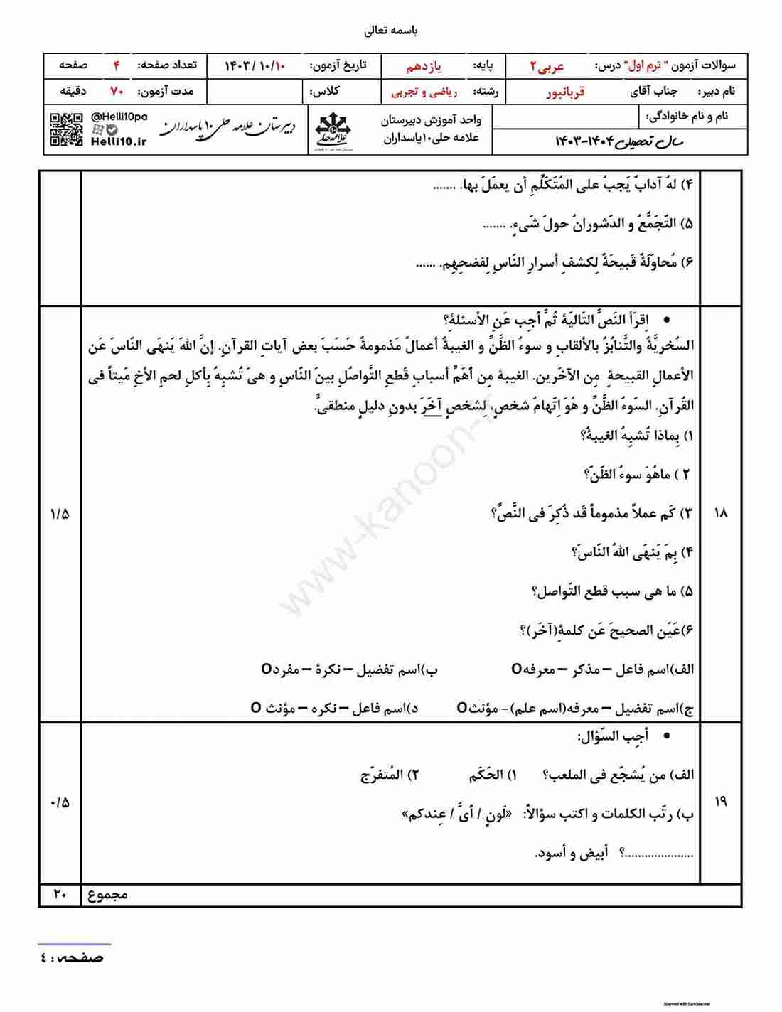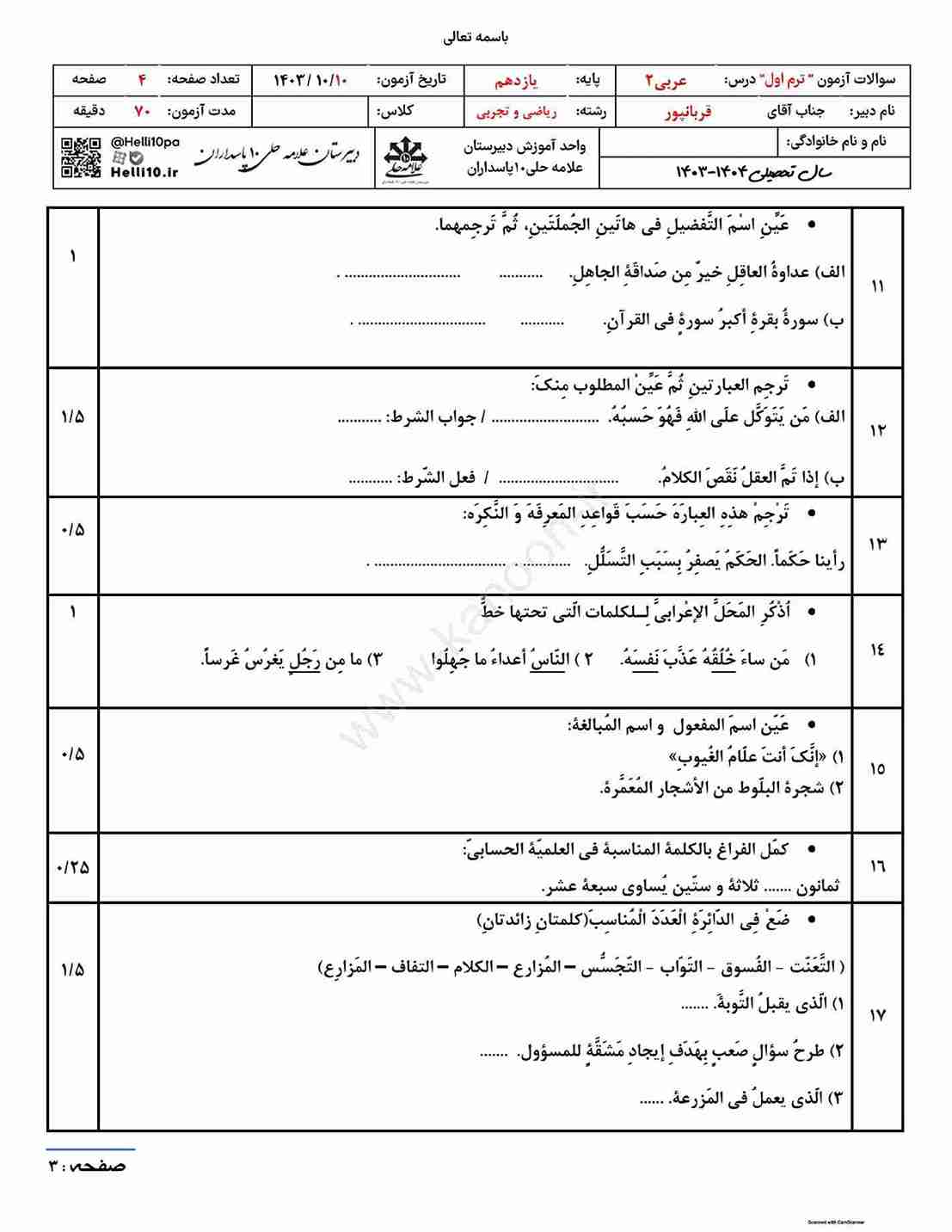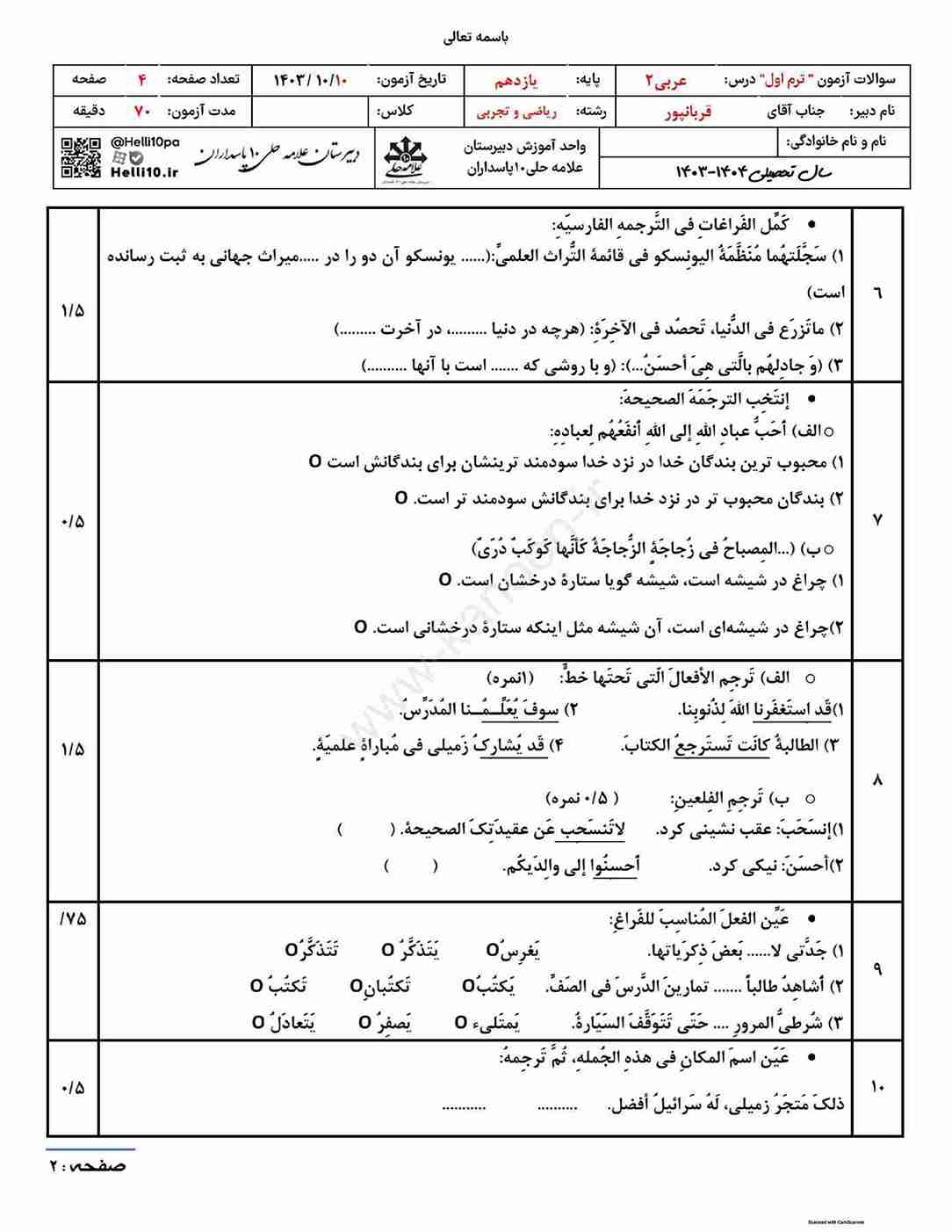لینک مشاهده نمونه سوال عربی یازدهم تجربی- ریاضی
