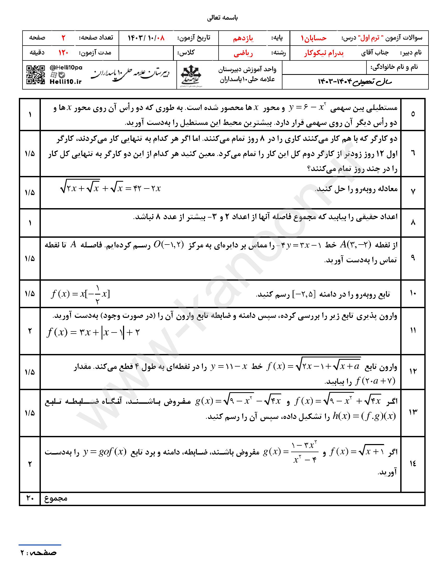 لینک مشاهده نمونه سوال حسابان یازدهم ریاضی