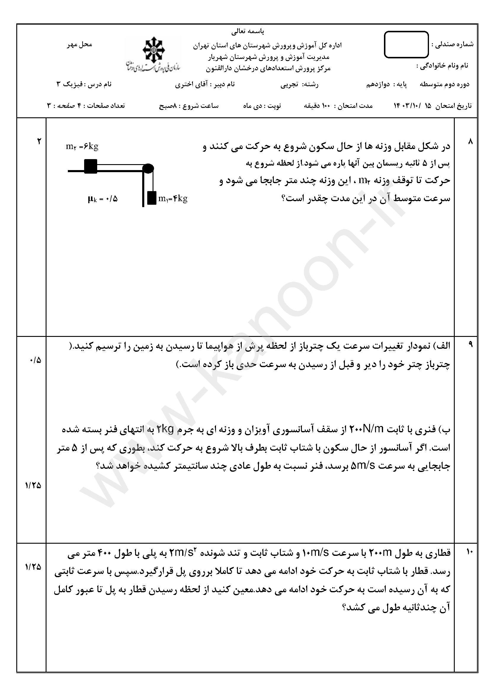 لینک مشاهده نمونه سوال فیزیک دوازدهم تجربی