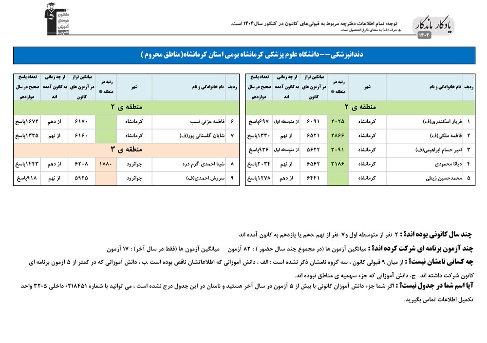 یادگار ماندگار : قبولی های کانونی دانشگاه علوم پزشکی کرمانشاه در همه رشته ها در سال 1404 را در ادامه مشاهده کنید.فایل با کیفیت قبولی های سال 1404 را در قسمت فایل های ضمیمه دانلود کنید.