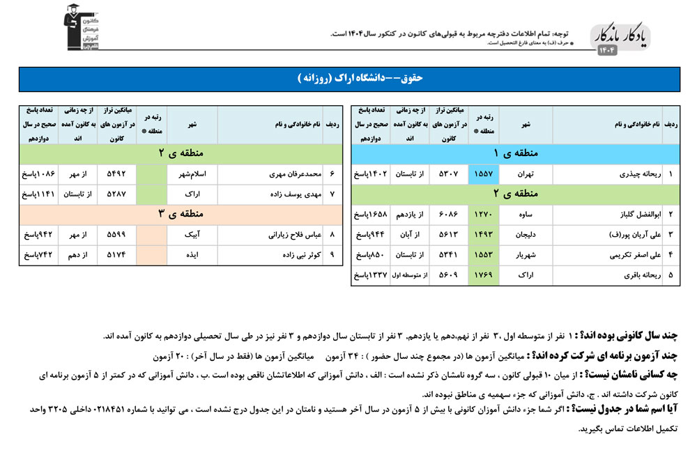 یادگار ماندگار : قبولی های کانونی دانشگاه اراک در همه رشته ها در سال 1404 را در ادامه مشاهده کنید.فایل با کیفیت قبولی های سال 1404 را در قسمت فایل های ضمیمه دانلود کنید.