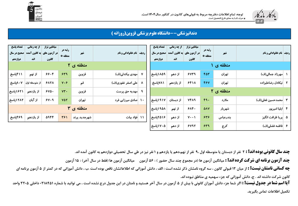 یادگار ماندگار : قبولی های کانونی دانشگاه علوم پزشکي قزوين در همه رشته ها در سال 1404 را در ادامه مشاهده کنید.فایل با کیفیت قبولی های سال 1404 را در قسمت فایل های ضمیمه دانلود کنید.