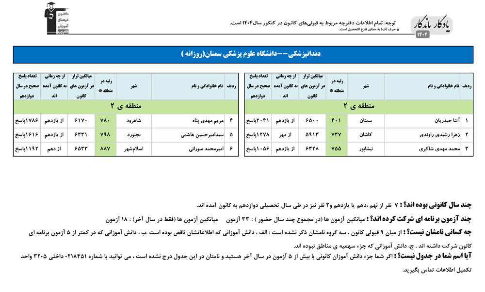 یادگار ماندگار : قبولی های کانونی دانشگاه علوم پزشکی سمنان در همه رشته ها در سال 1404 را در ادامه مشاهده کنید.فایل با کیفیت قبولی های سال 1404 را در قسمت فایل های ضمیمه دانلود کنید.