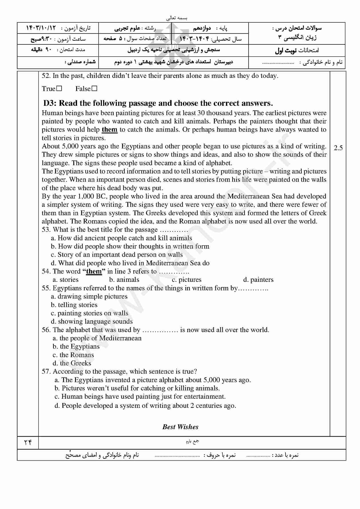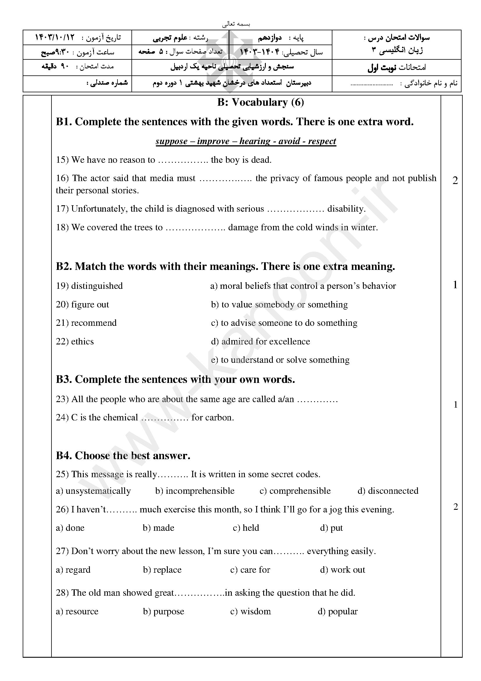 ما یک نمونه سوال در اینجا قرار دادیم تا با استاندارد آزمونها آشنا شوید. برای دسترسی به تمام نمونه سوالات نوبت اول روی عکس زیر کلیک کنید