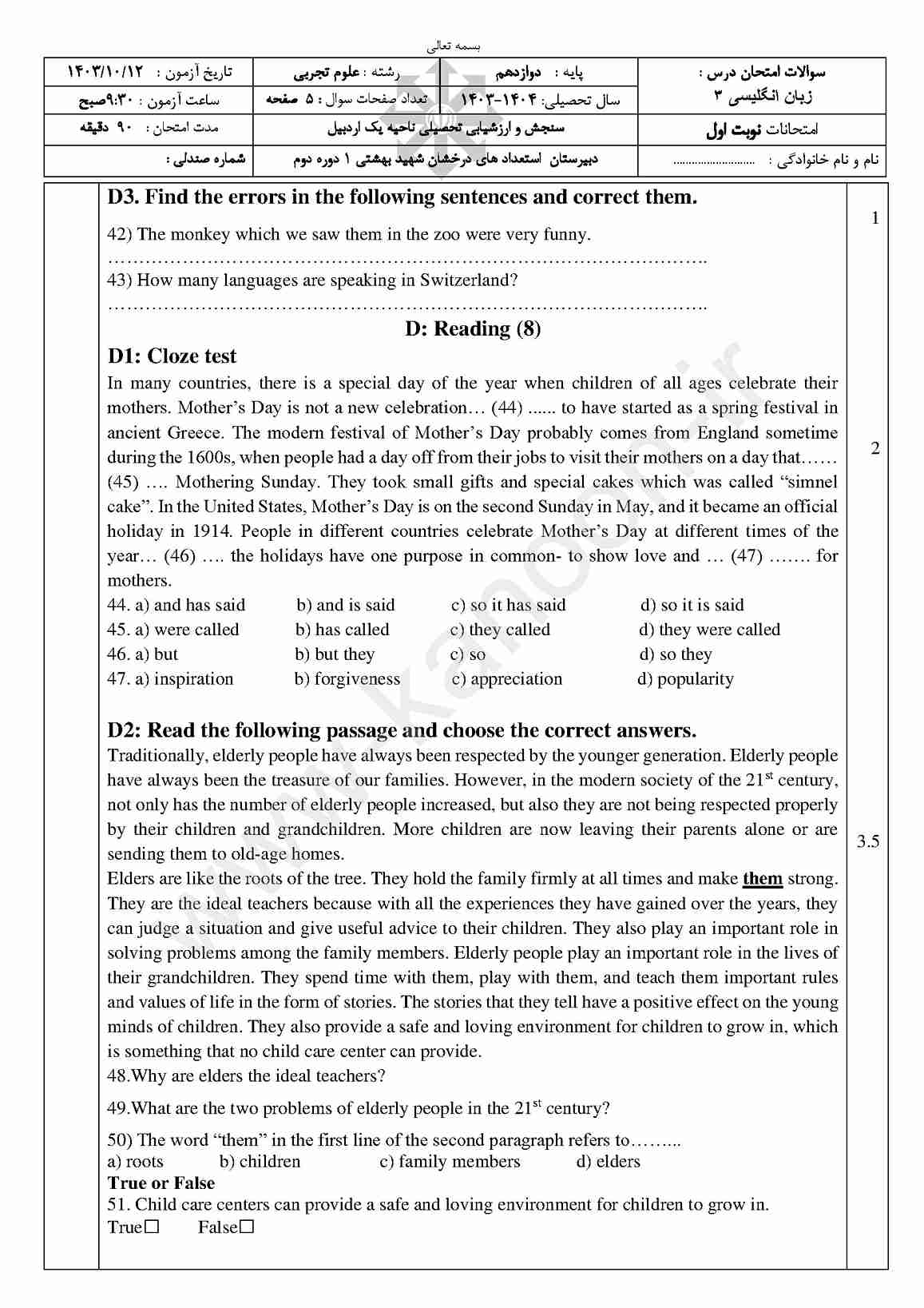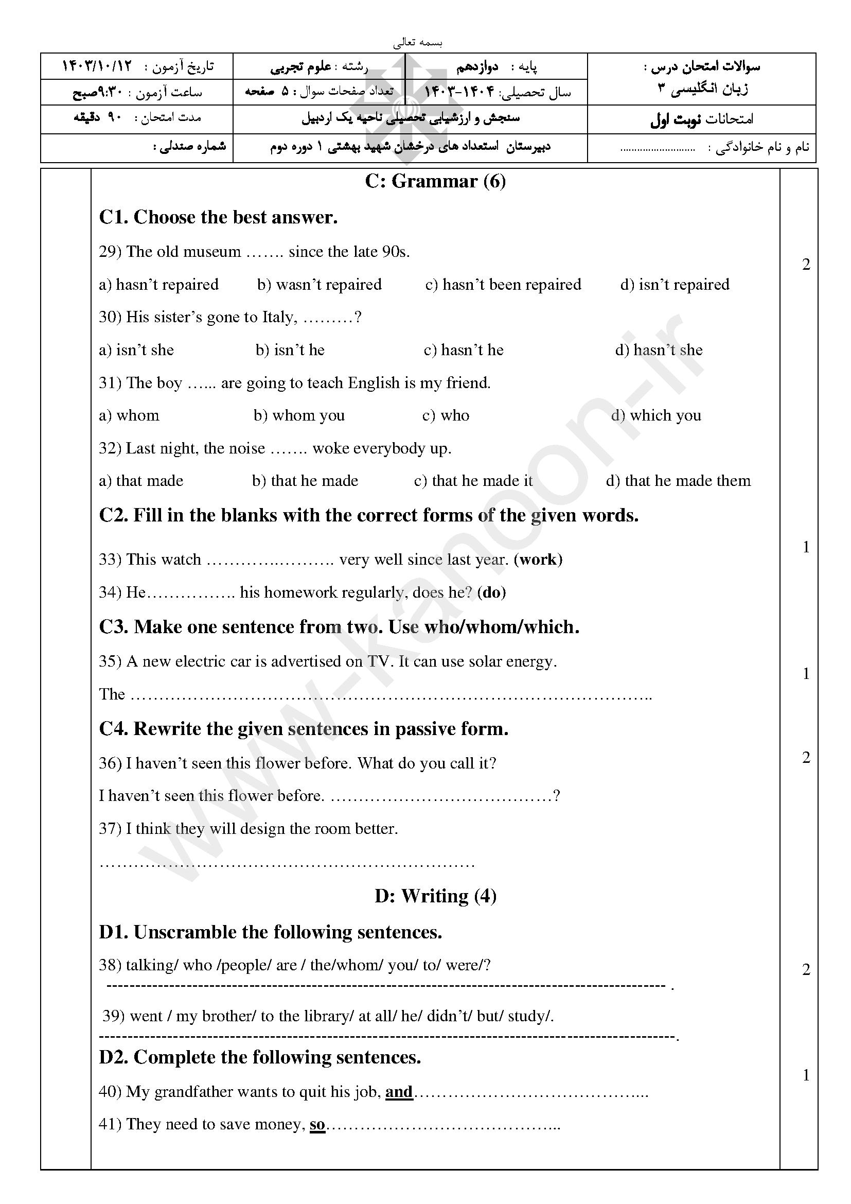 دسترسی به نمونه سوالات امتحانی زبان دوازدهم ریاضی-تجربی نوبت اول و نیم سال اول، بهترین راهکار برای آمادگی در امتحانات دیماه است. این مجموعه تخصصی شامل آرشیو کامل نمونه سوالات تیزهوشان، مدارس نمونه دولتی، مدارس غیرانتفاعی برتر و مدارس دولتی سراسر کشور میباشد.