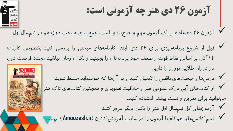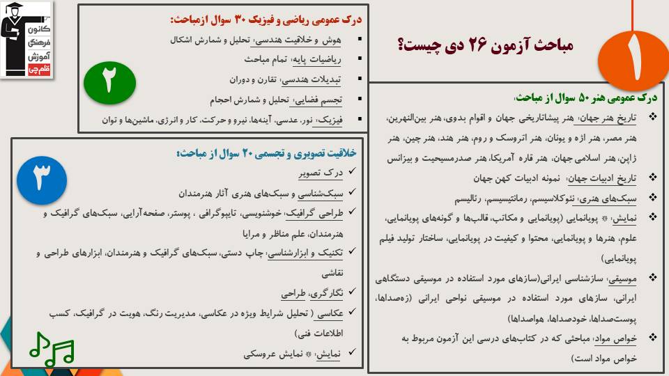 در آزمون 26 دی گروه هنر کدام مباحث جمعبندی میشوند؟