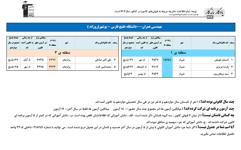 یادگار ماندگار : قبولی های کانونی دانشگاه خلیج فارس - بوشهر در همه رشته ها در سال 1404 را در ادامه مشاهده کنید.فایل با کیفیت قبولی های سال 1404 را در قسمت فایل های ضمیمه دانلود کنید.