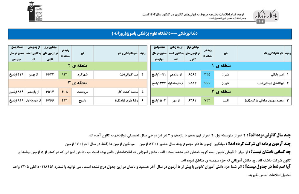 یادگار ماندگار : قبولی های کانونی دانشگاه علوم پزشکی یاسوج در همه رشته ها در سال 1404 را در ادامه مشاهده کنید.فایل با کیفیت قبولی های سال 1404 را در قسمت فایل های ضمیمه دانلود کنید.