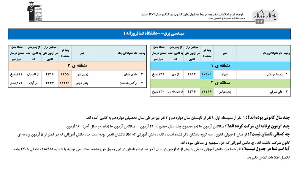 یادگار ماندگار : قبولی های کانونی دانشگاه فسا را در همه رشته ها در سال 1404 را در ادامه مشاهده کنید.فایل با کیفیت قبولی های سال 1404 را در قسمت فایل های ضمیمه دانلود کنید.